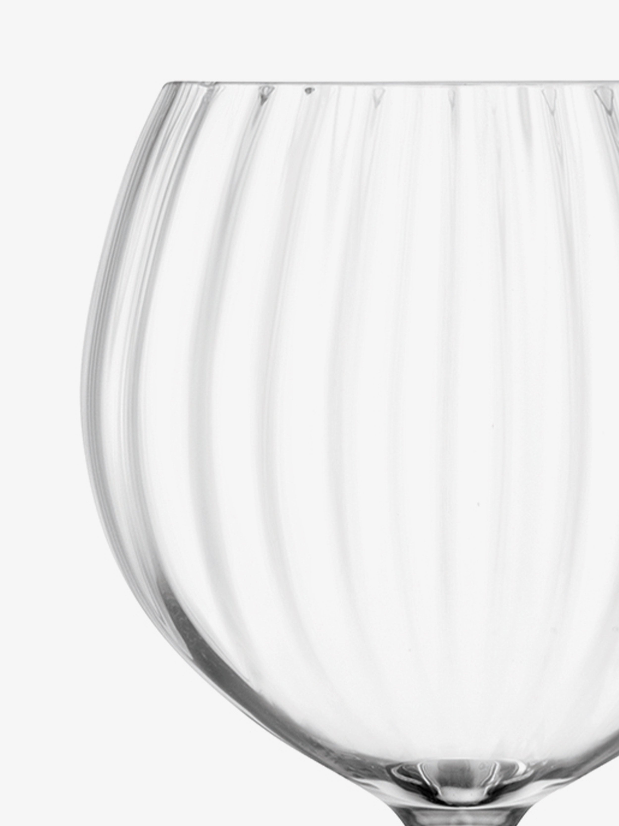 Set of two finely-fluted balloon glasses with generous, rounded bowls. The subtle texture catches and reflects the light. For wine, long cocktails and spritzes.