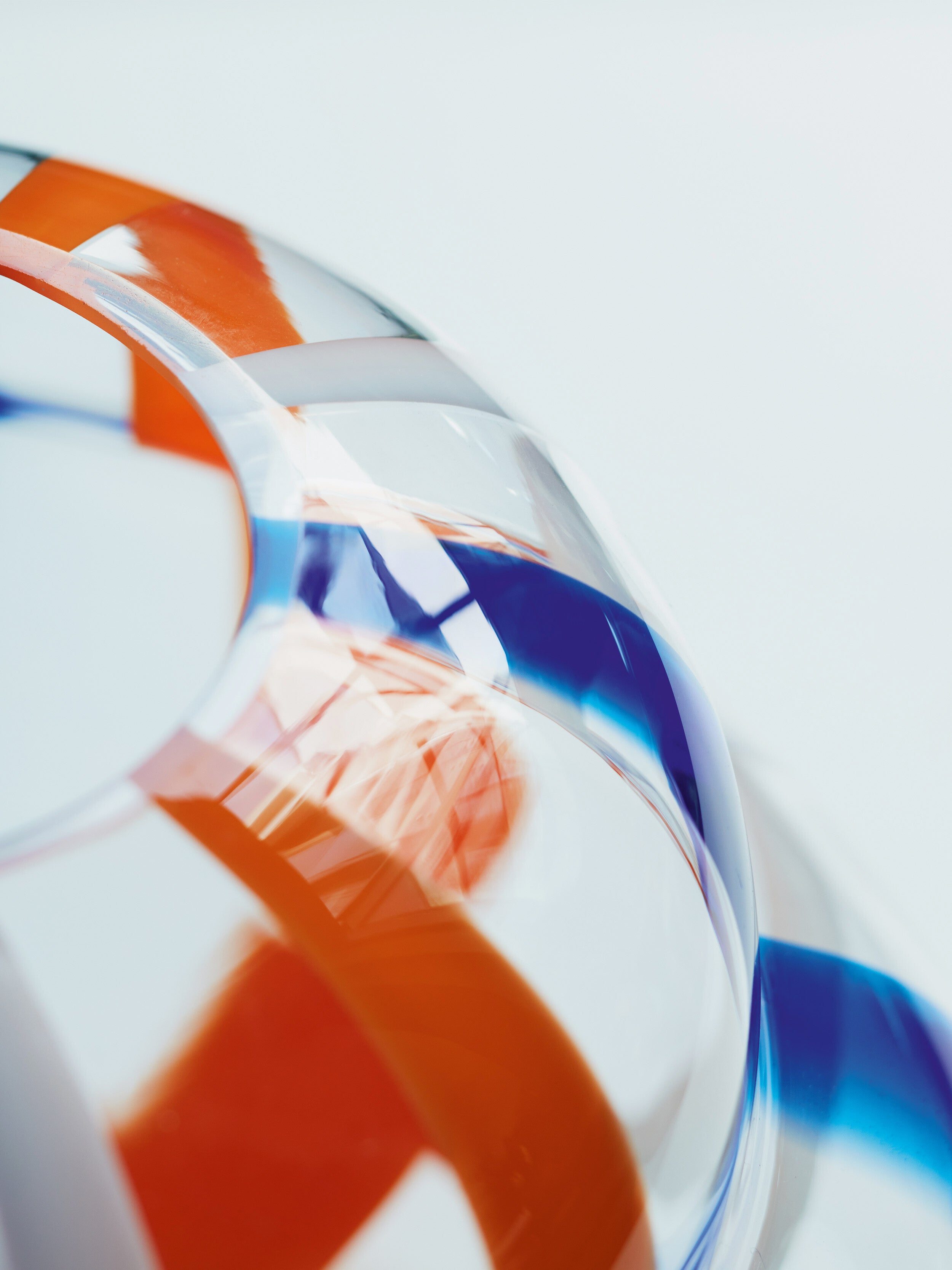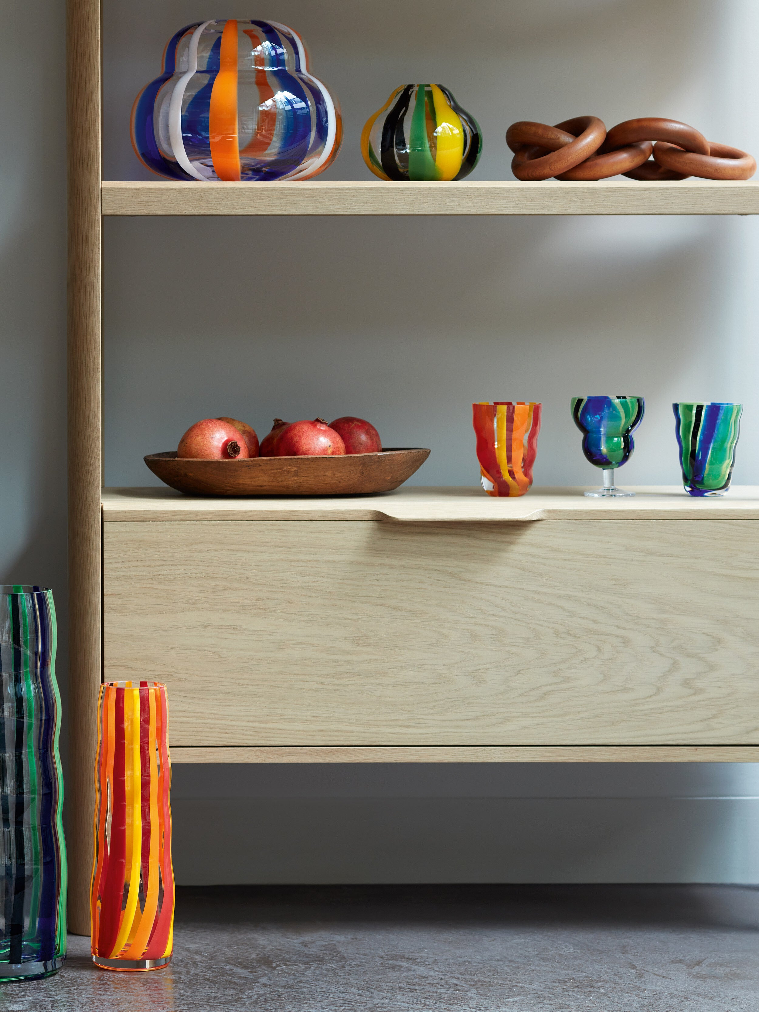 Clear glass is lowered into a pre-mould lined with coloured solid glass rods, fusing them together. The fused gather is encased in another layer of clear glass and mouth blown into a mould. This blowing process expands the striped gather, resulting in an organic form with a distinctive pattern. No two vessels will ever be the same ensuring each object is unique.