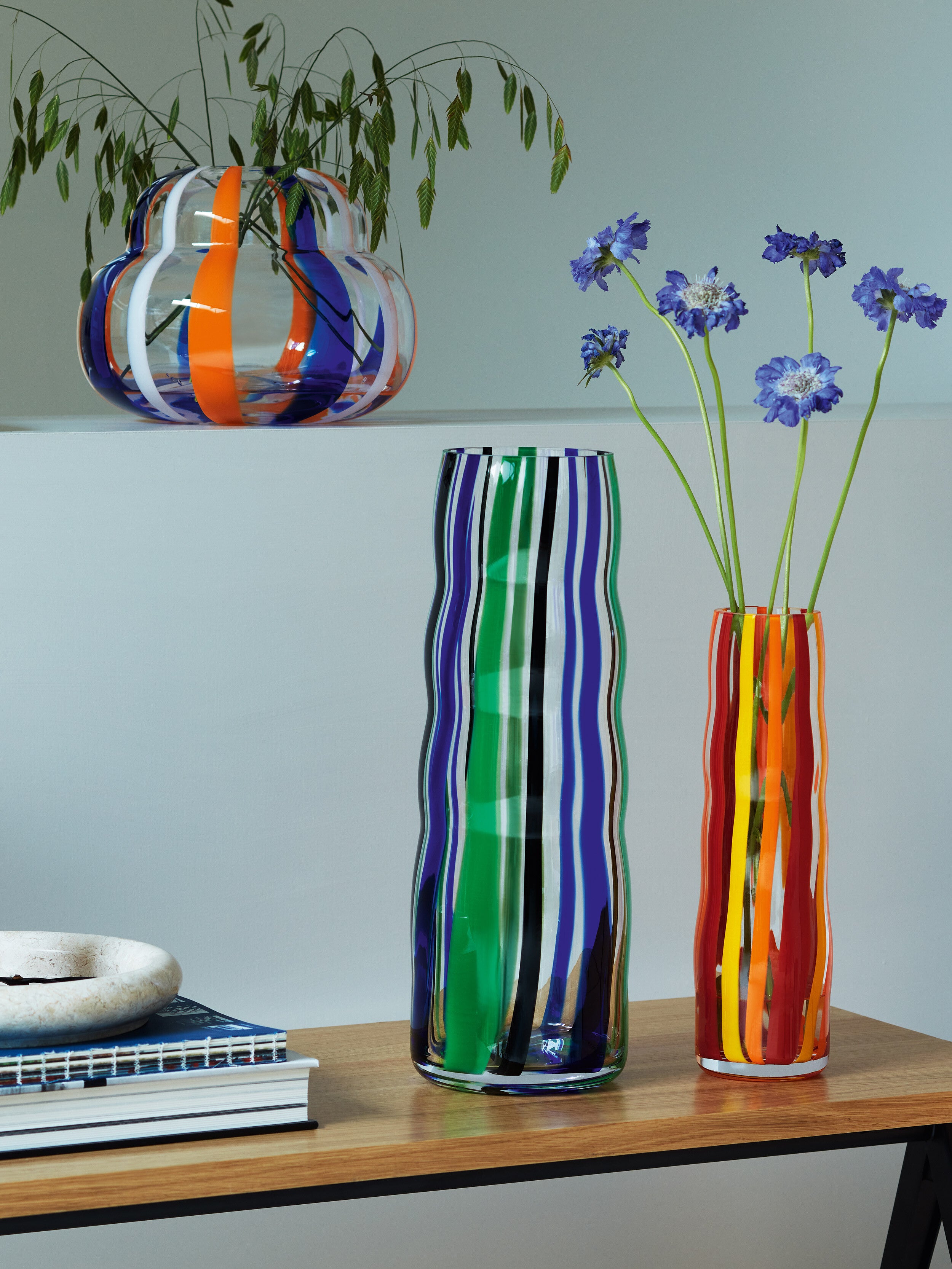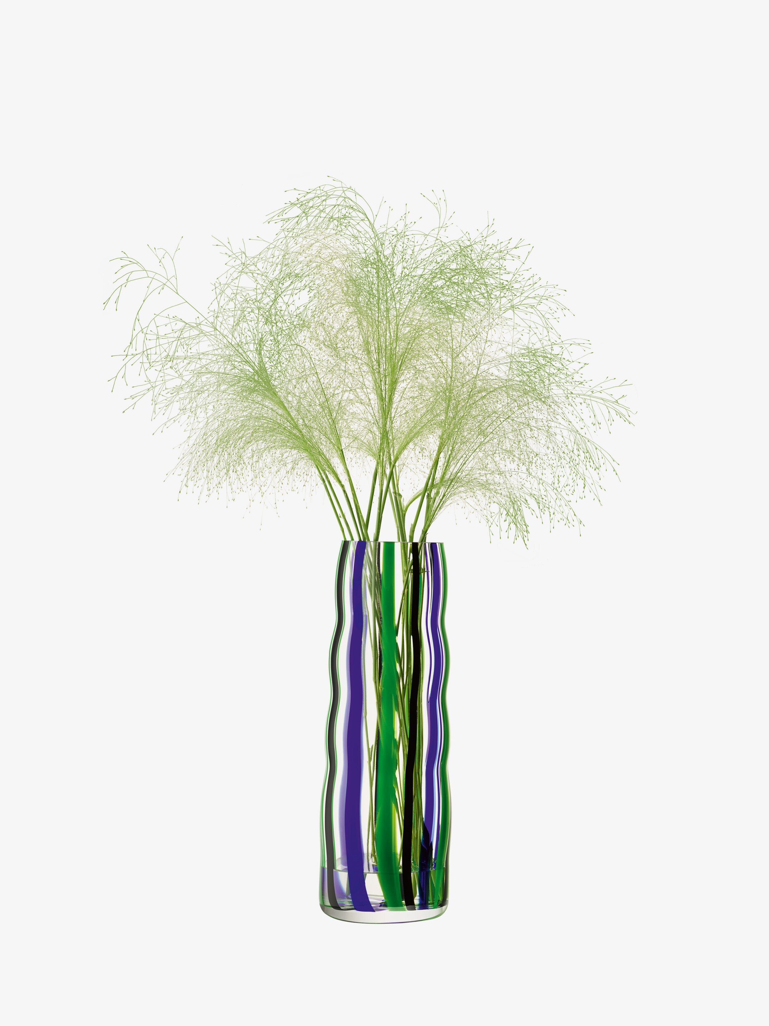 Clear glass is lowered into a pre-mould lined with coloured solid glass rods, fusing them together. The fused gather is encased in another layer of clear glass and mouth blown into a mould. This blowing process expands the striped gather, resulting in an organic form with a distinctive pattern. No two vessels will ever be the same ensuring each object is unique.