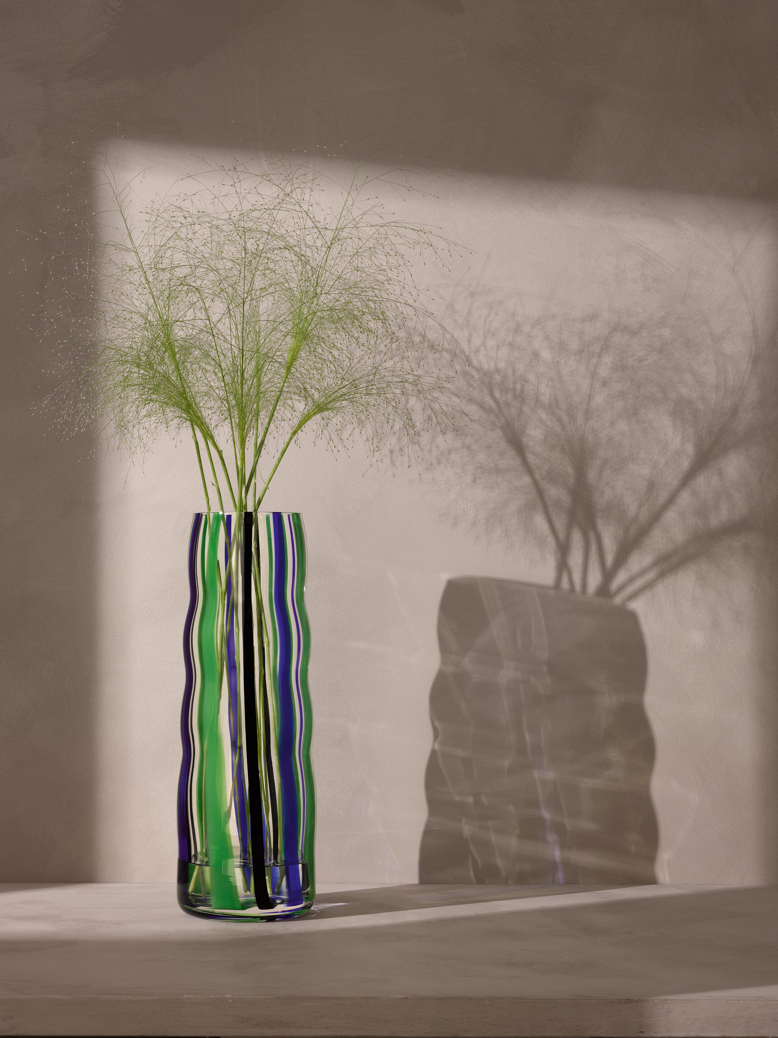 A tall and large mouth-blown vase with a distinctive folk-inspired pattern and an undulating silhouette. For statement floral centrepieces, larger branches and foliage.