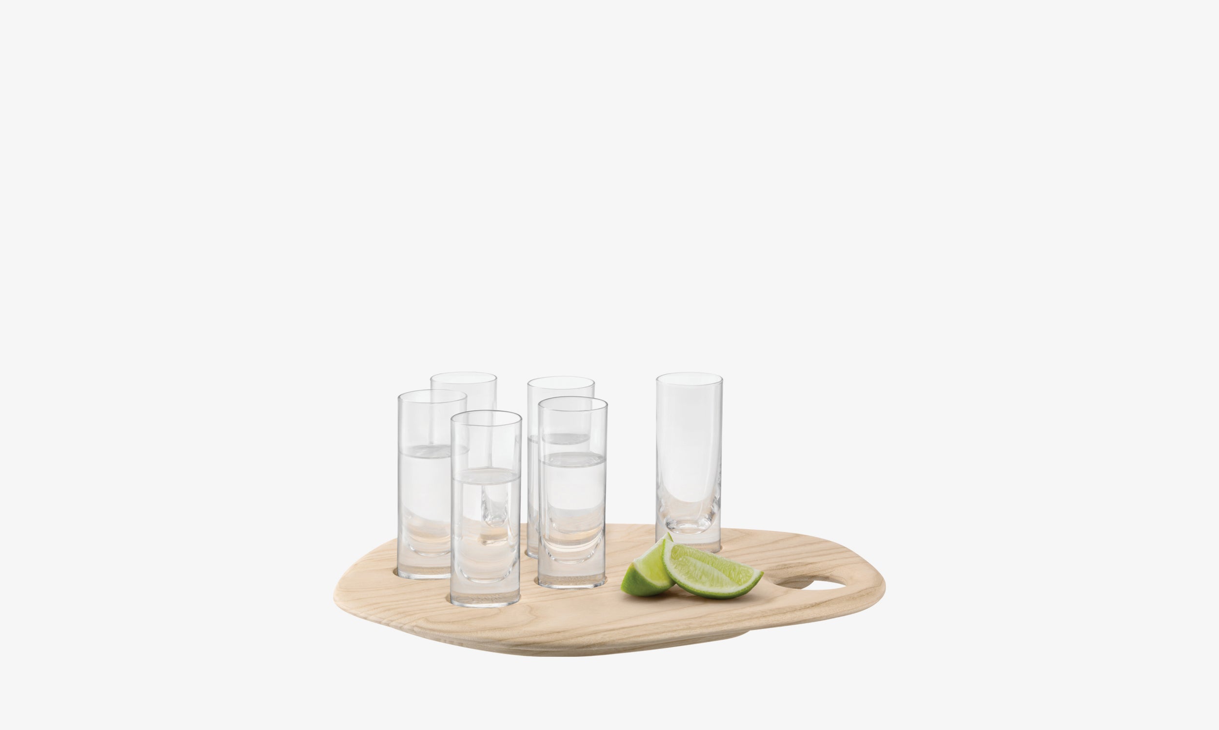A contemporary mixed material design for serving shots. The cylindrical shot glasses sit on an organically-shaped natural ash board with a thumb hole that is designed for ease of carrying.