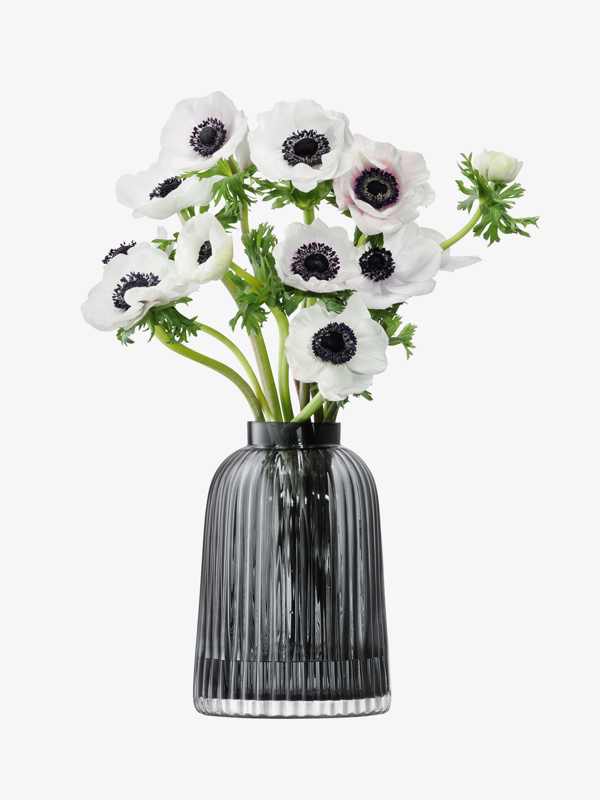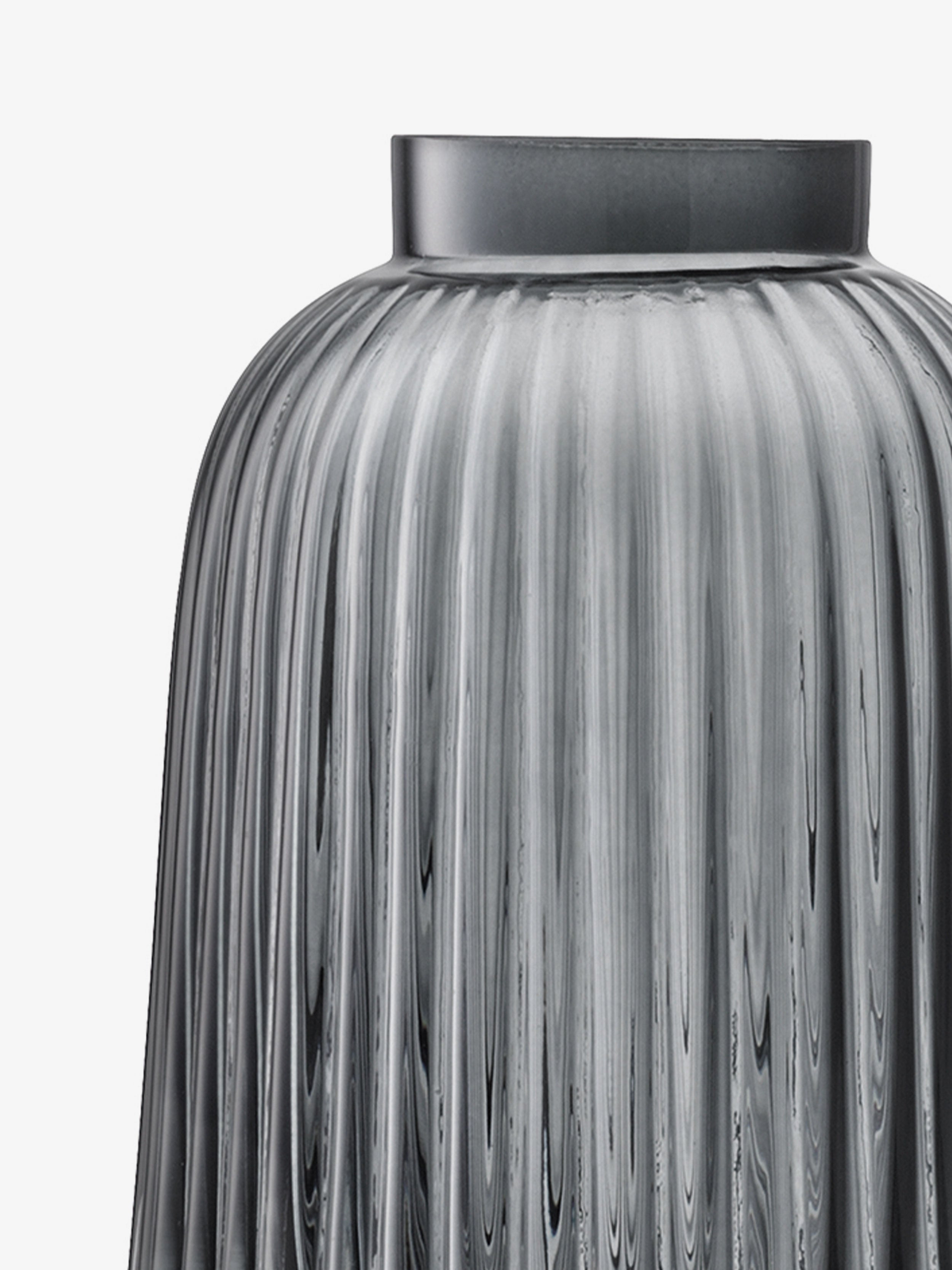 A mouth-blown glass vase with a narrow neck, curved shoulders and flared base. The tactile, pleated finish is inspired by the gathering of pleated fabric.
