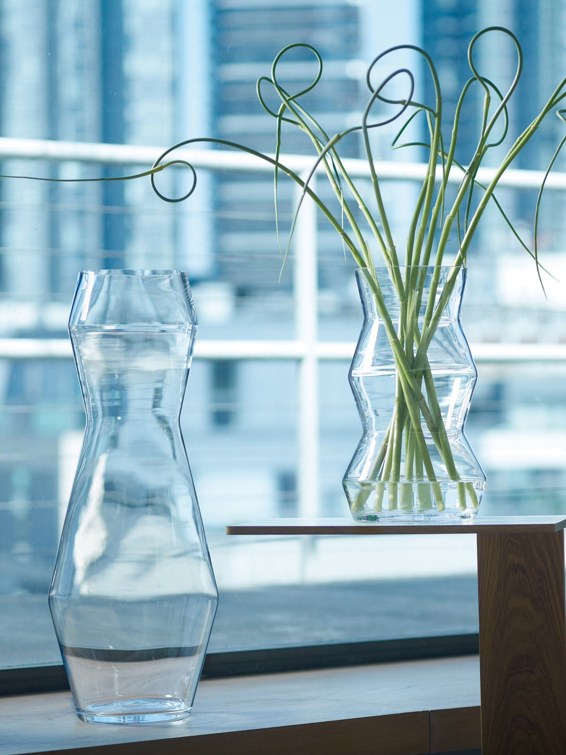 Stacked geometry and angular modern shapes define the SCULPT Collection. The carved wooden totems of Constantin Brancusi are referenced in the sculptural outlines of each mouth-blown vase, appearing to expand and contract with rhythm.