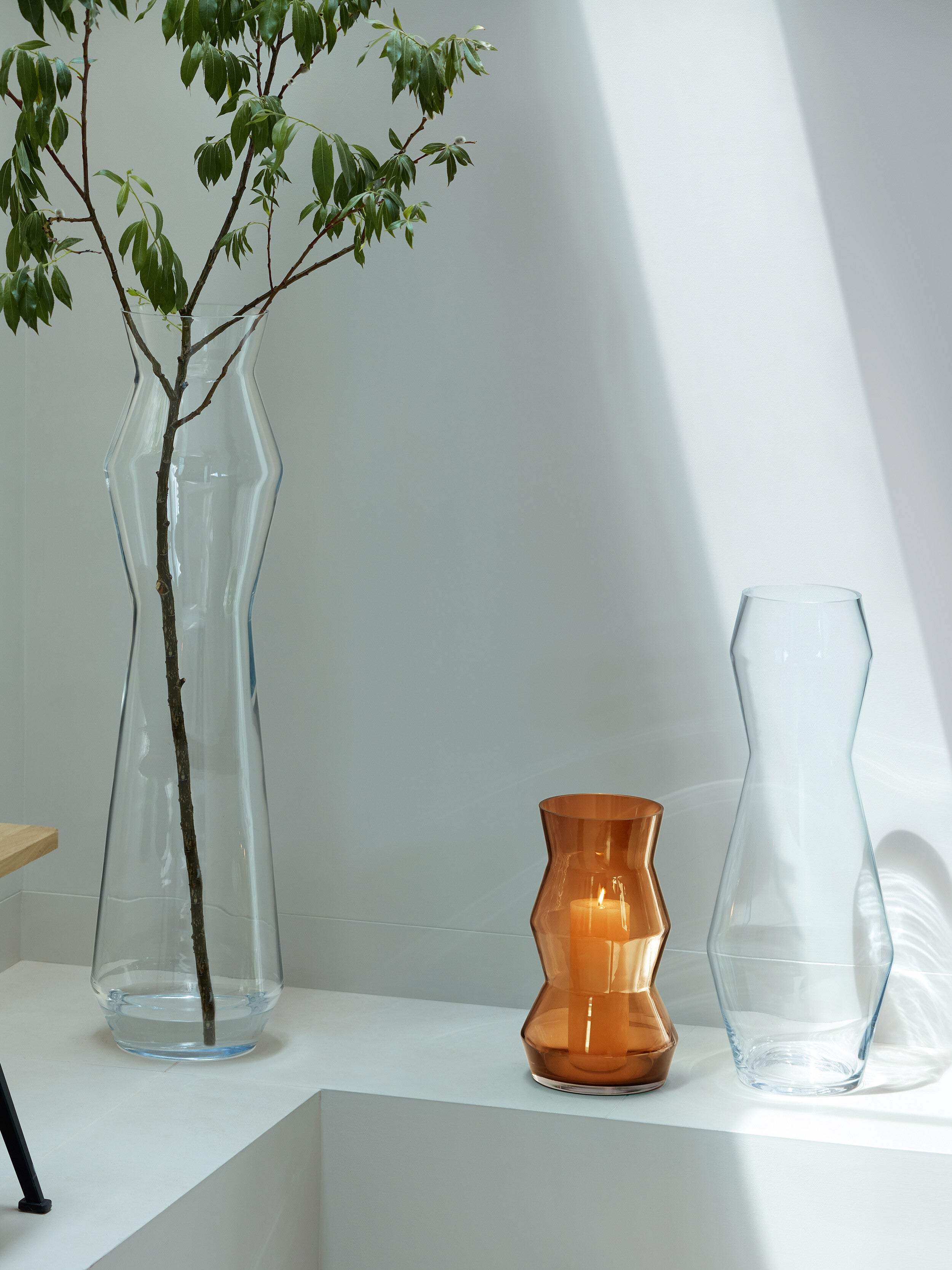 A tall, modern mouth-blown vase informed by stacked geometry. Suitable for large bouquets and seasonal branches.