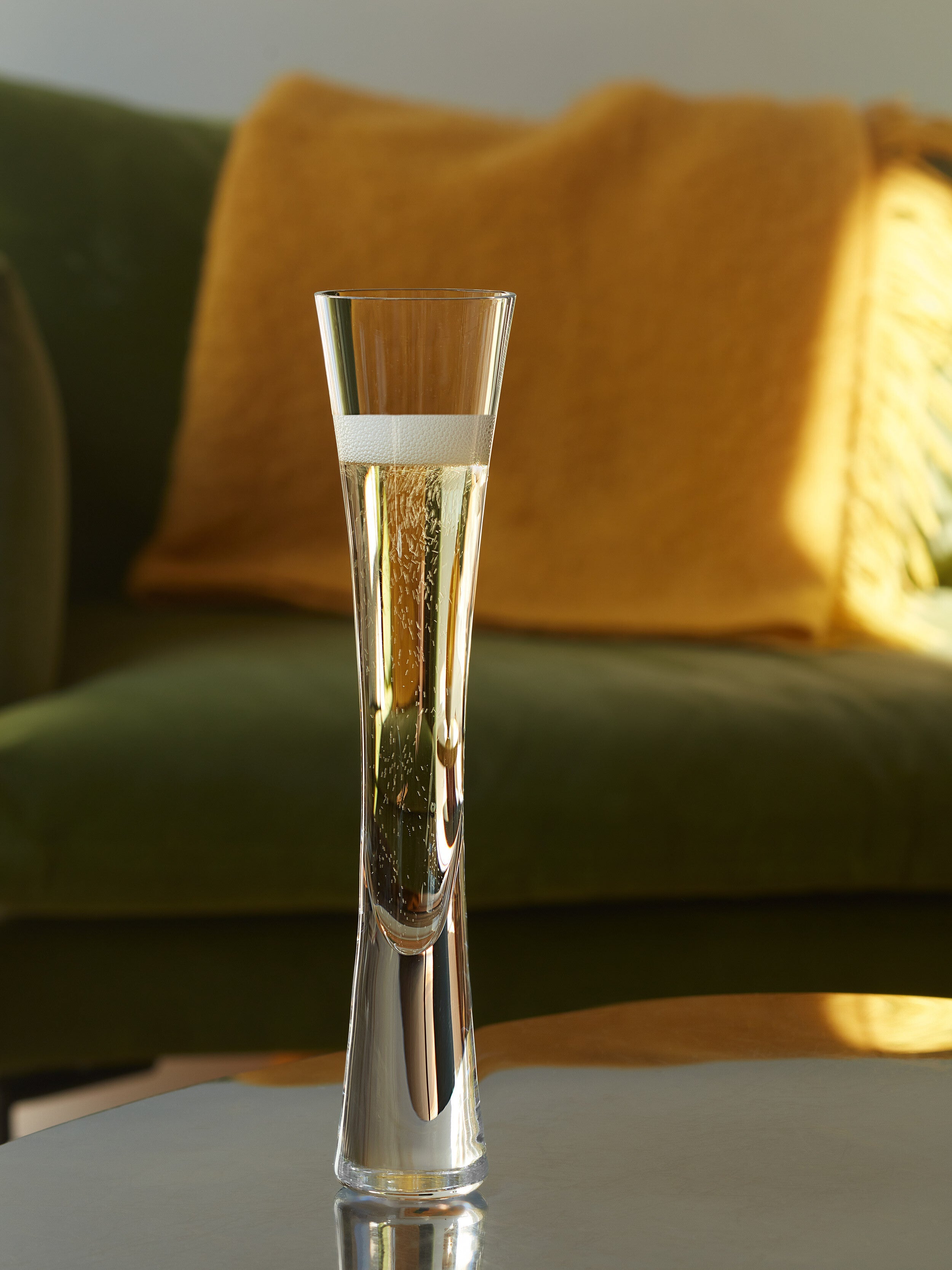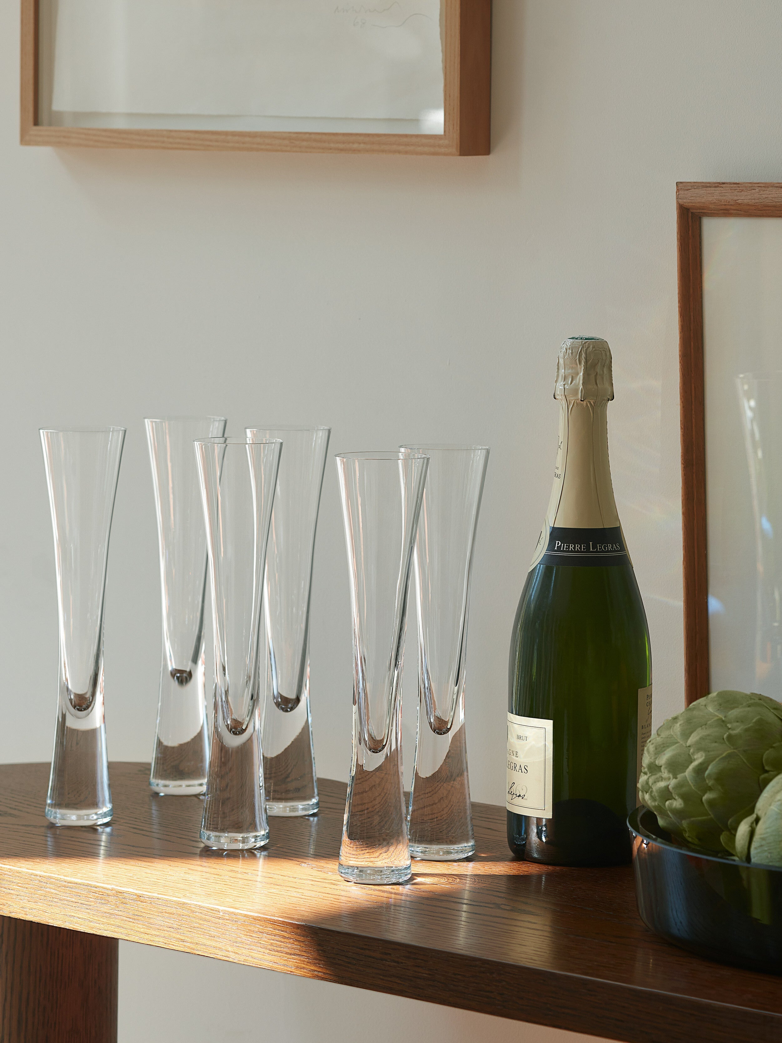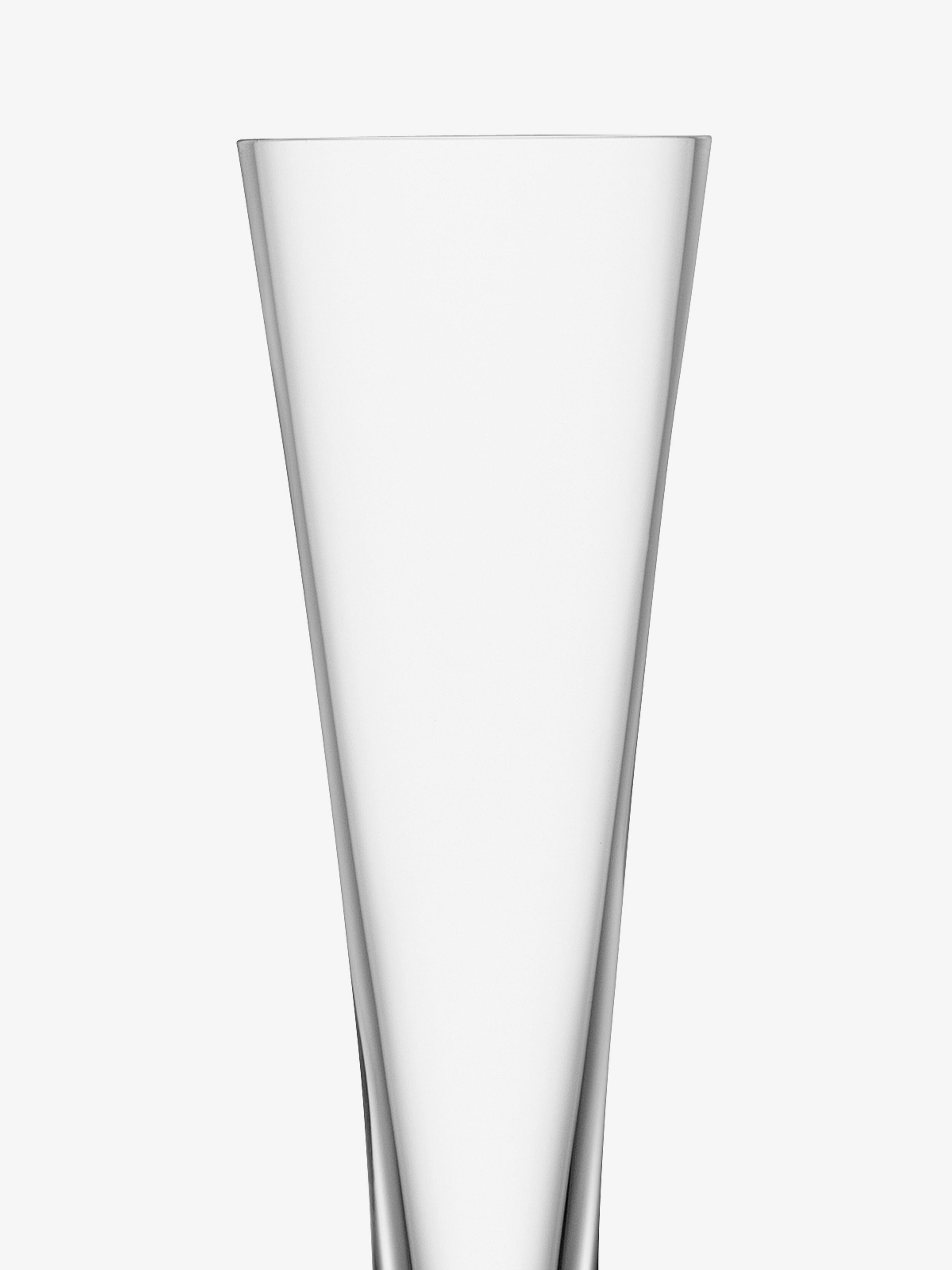 An exclusive set of six Moya champagne flutes. Each glass has fine bowls which taper towards a solid, flared stem, mouth blown as one piece of glass. An ideal set for serving champagne, prosecco or sparkling cocktails - or as a celebratory gift.