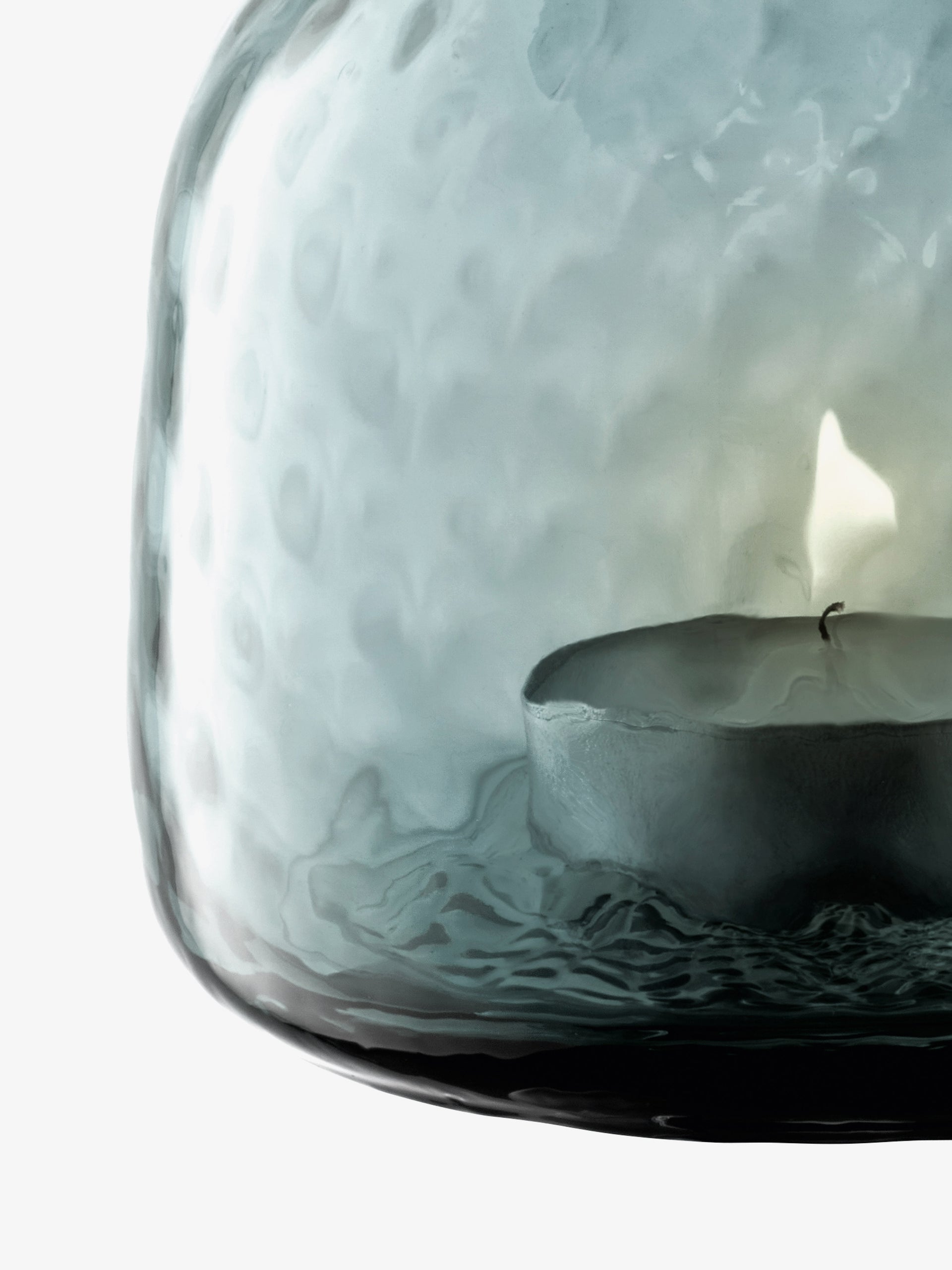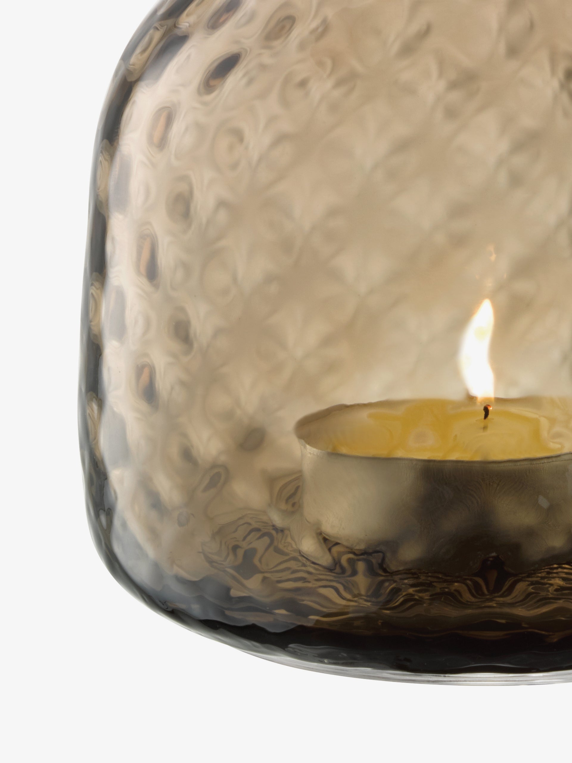 A rounded mouth-blown tealight holder/vase with fine walls and an all over texture. Supplied with tealight candle. When a candle burns within, the undulating surface beautifully refracts the light, casting a patterned glow over the room.