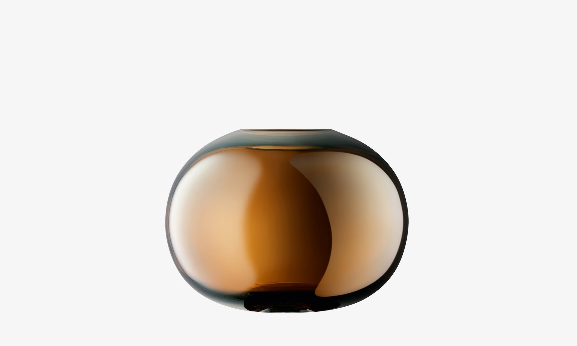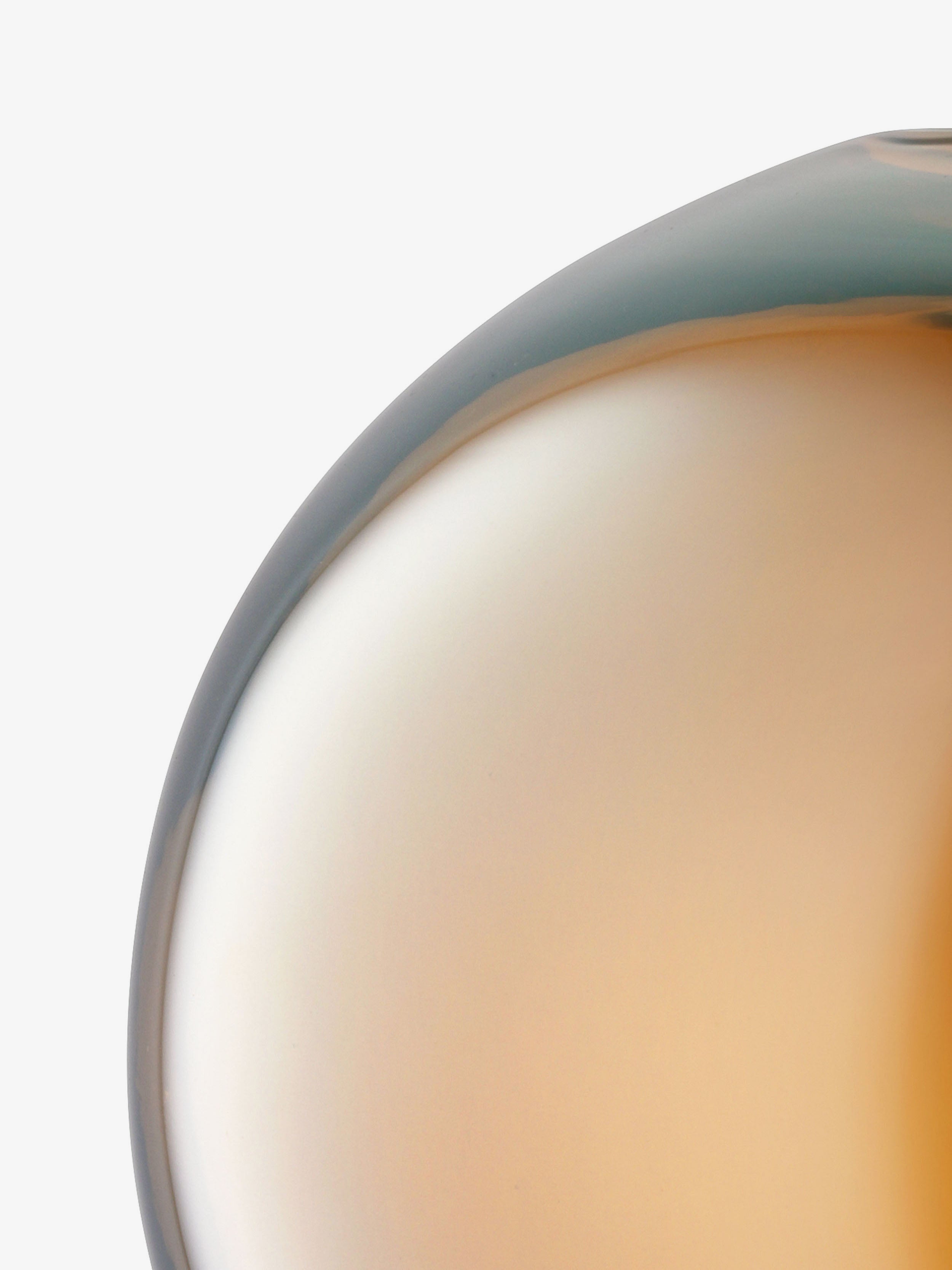 Mouth blown by skilled glassblowers to create a spherical vase. Layers of coloured and clear glass are gathered and shaped before blowing into the mould. The rim is scissor cut to achieve a thick, rounded finish. An iridescent lustre is applied by hand while the glass is still hot.