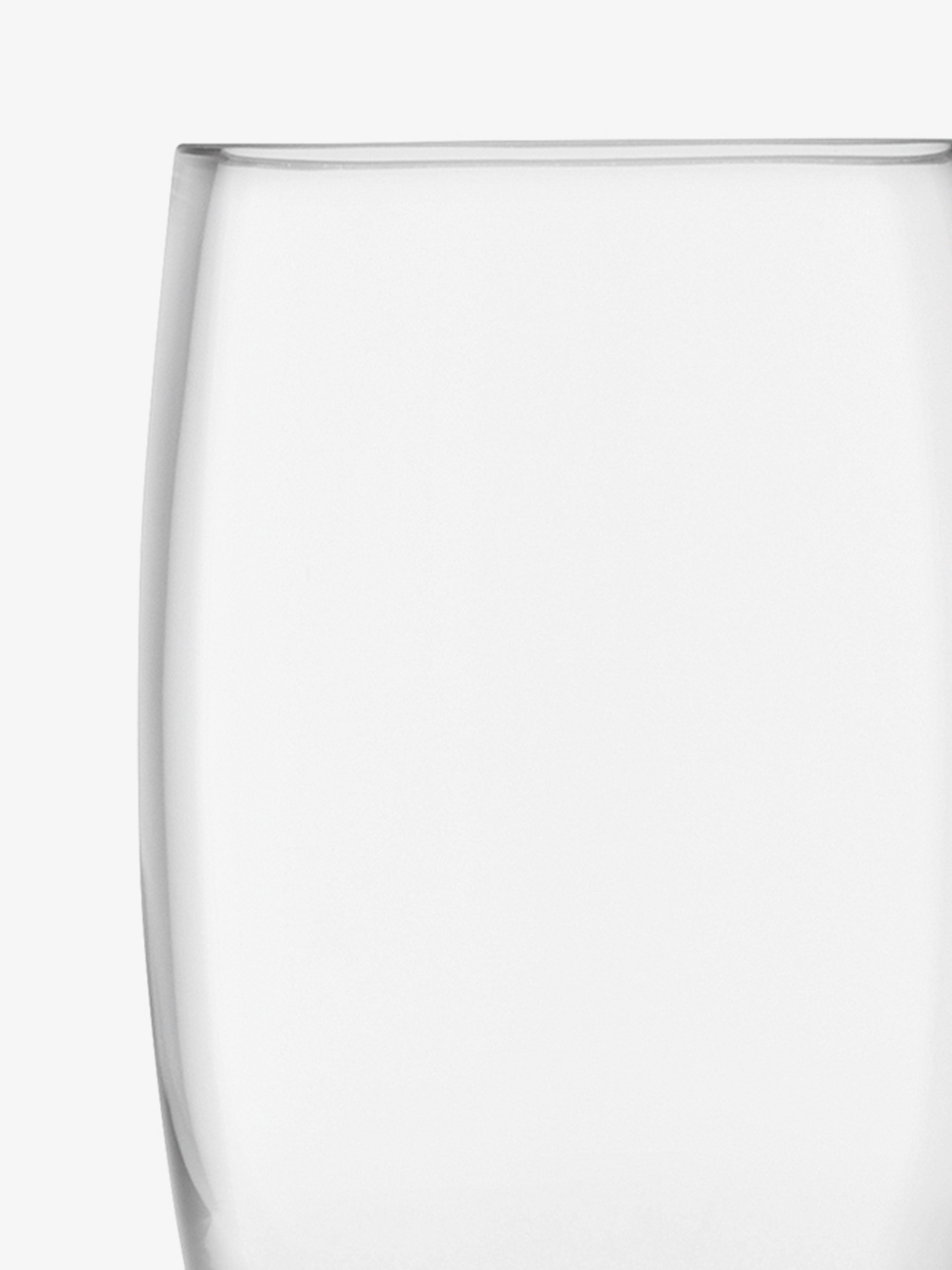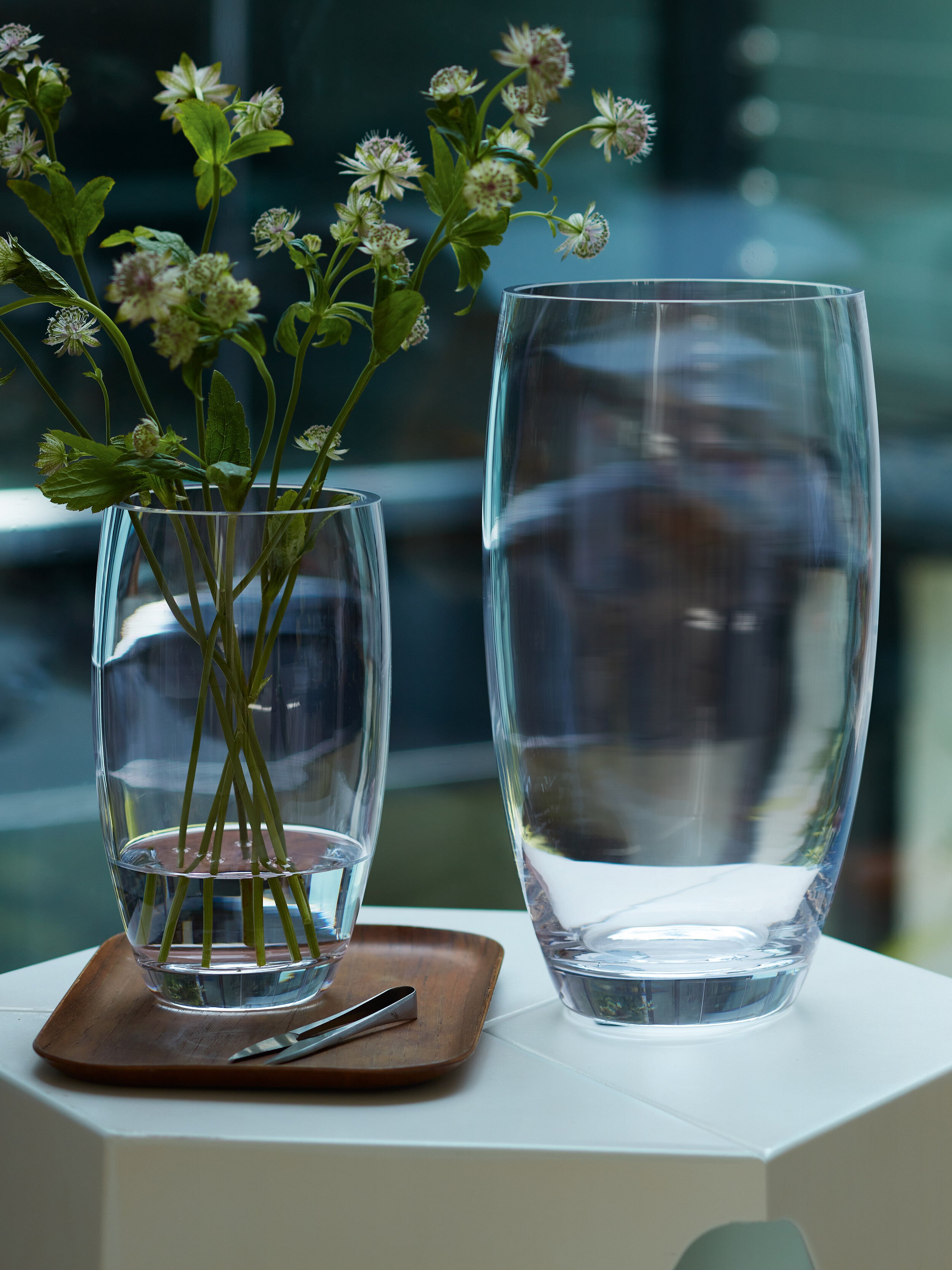 A barrel-shaped mouth-blown glass vase with thick, curved walls. Designed for mixed bouquets or a few large flower heads.