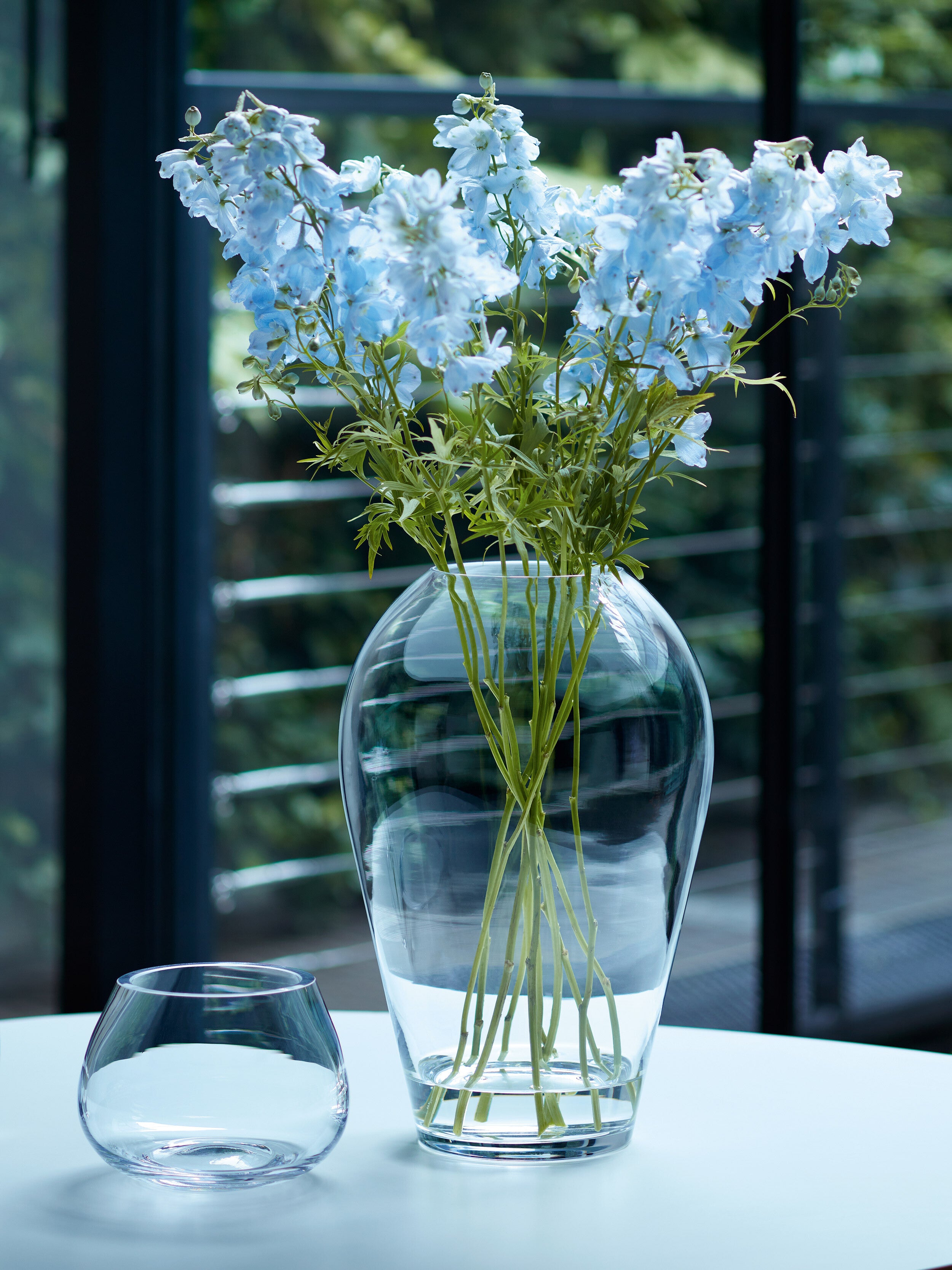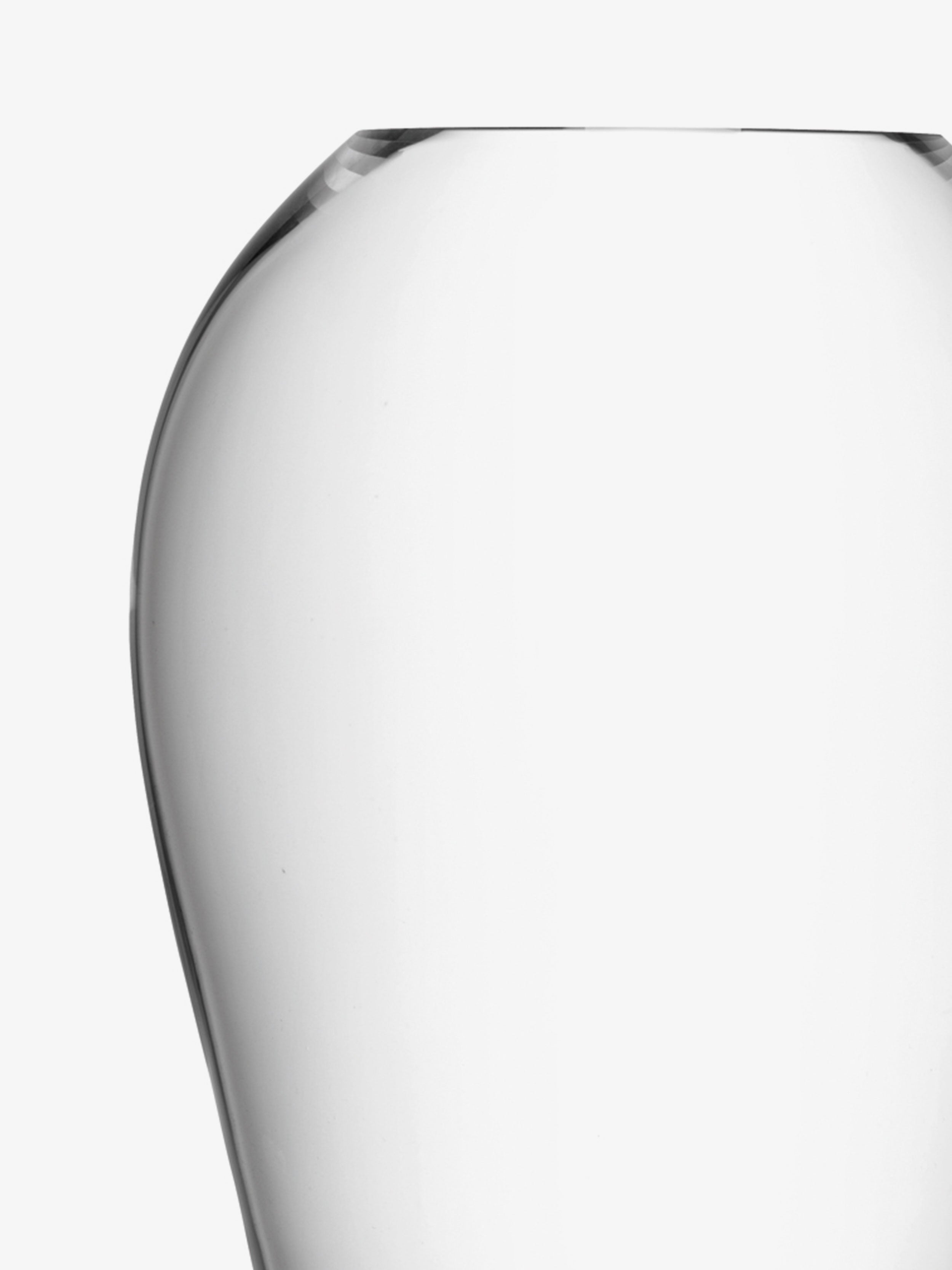 A mouth-blown glass vase with thick walls which curve at the top to narrow the opening. Designed for tall stems of flowers or foliage.