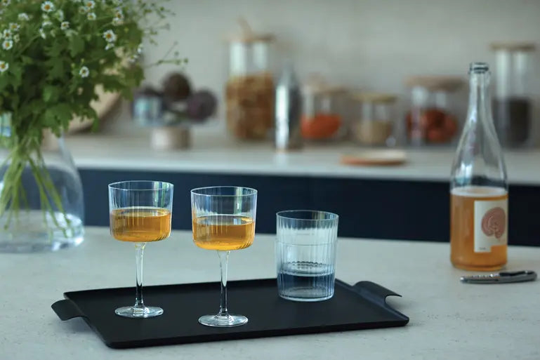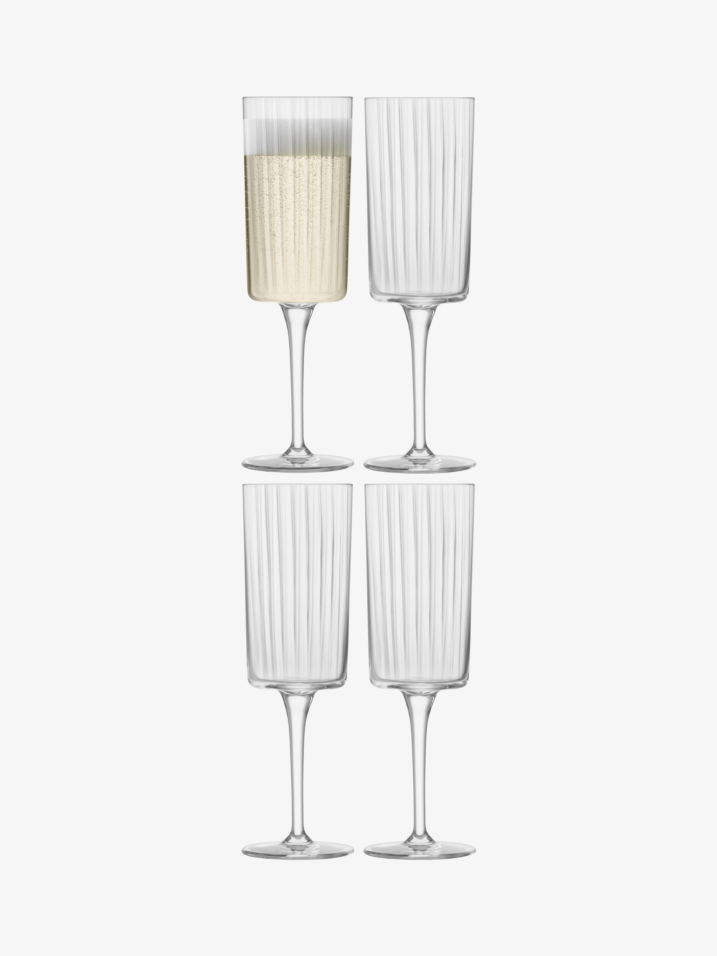 A set of four flutes with fine textured walls, a modern shape and casual stems. For serving champagne and prosecco.