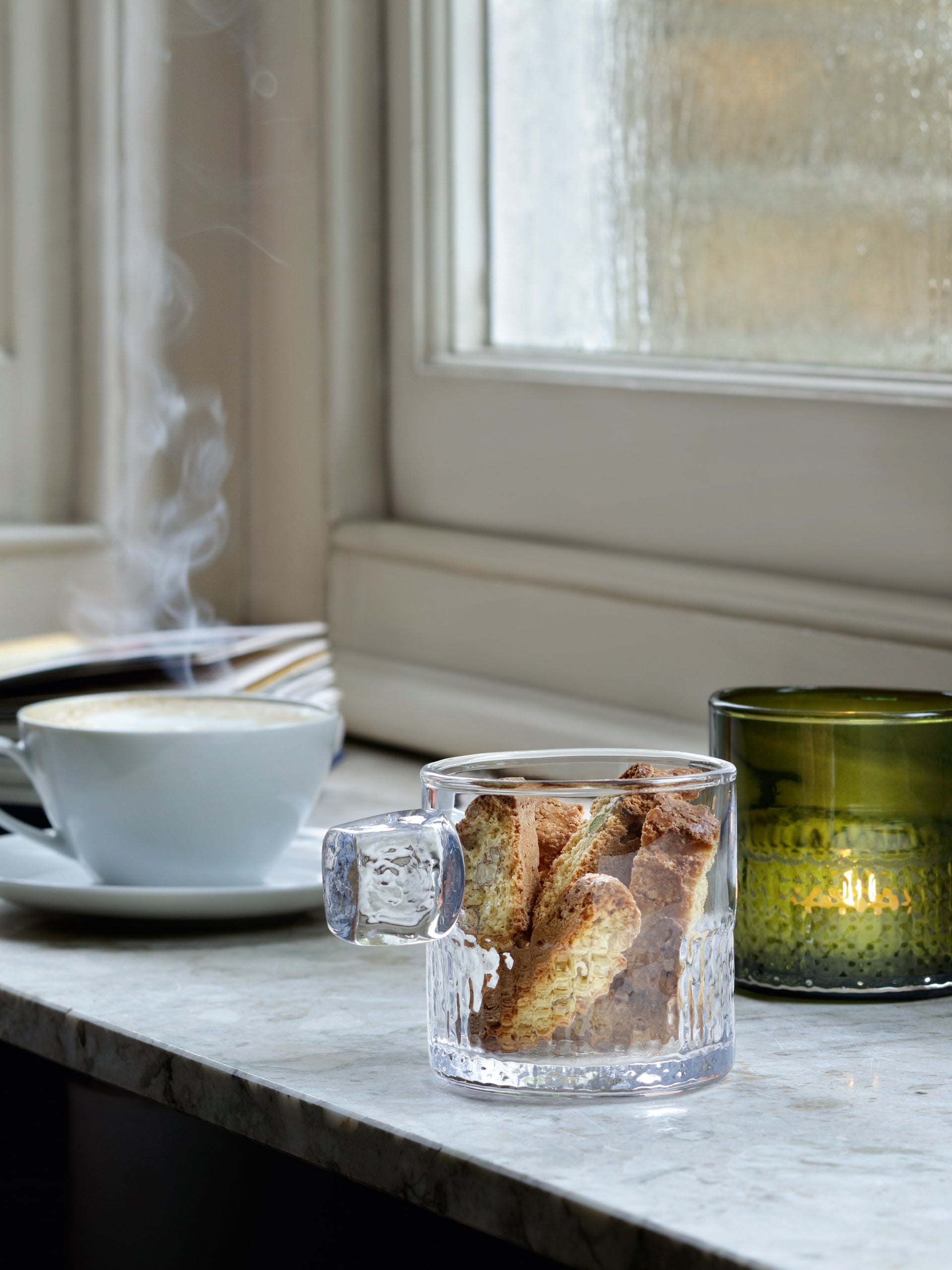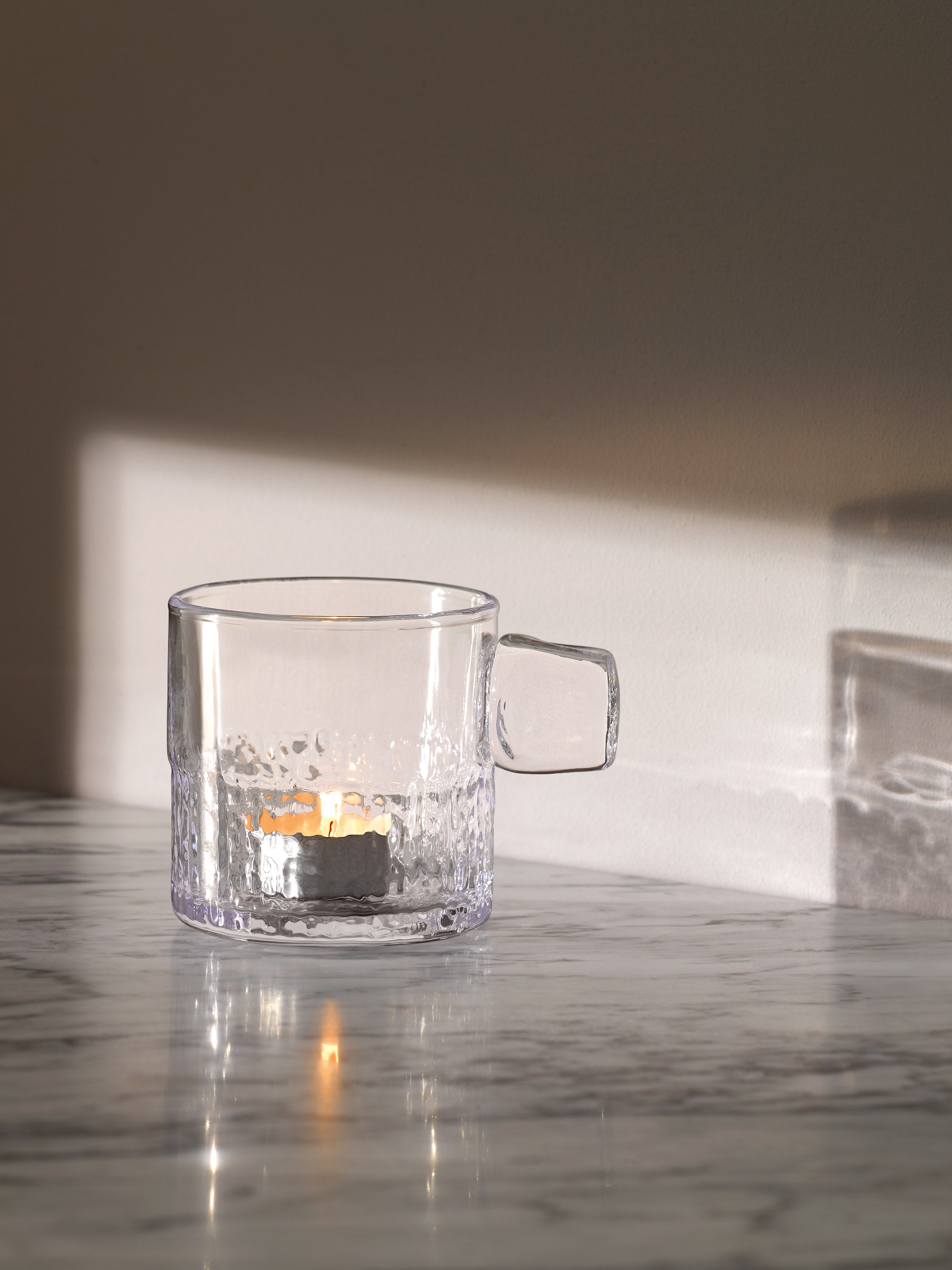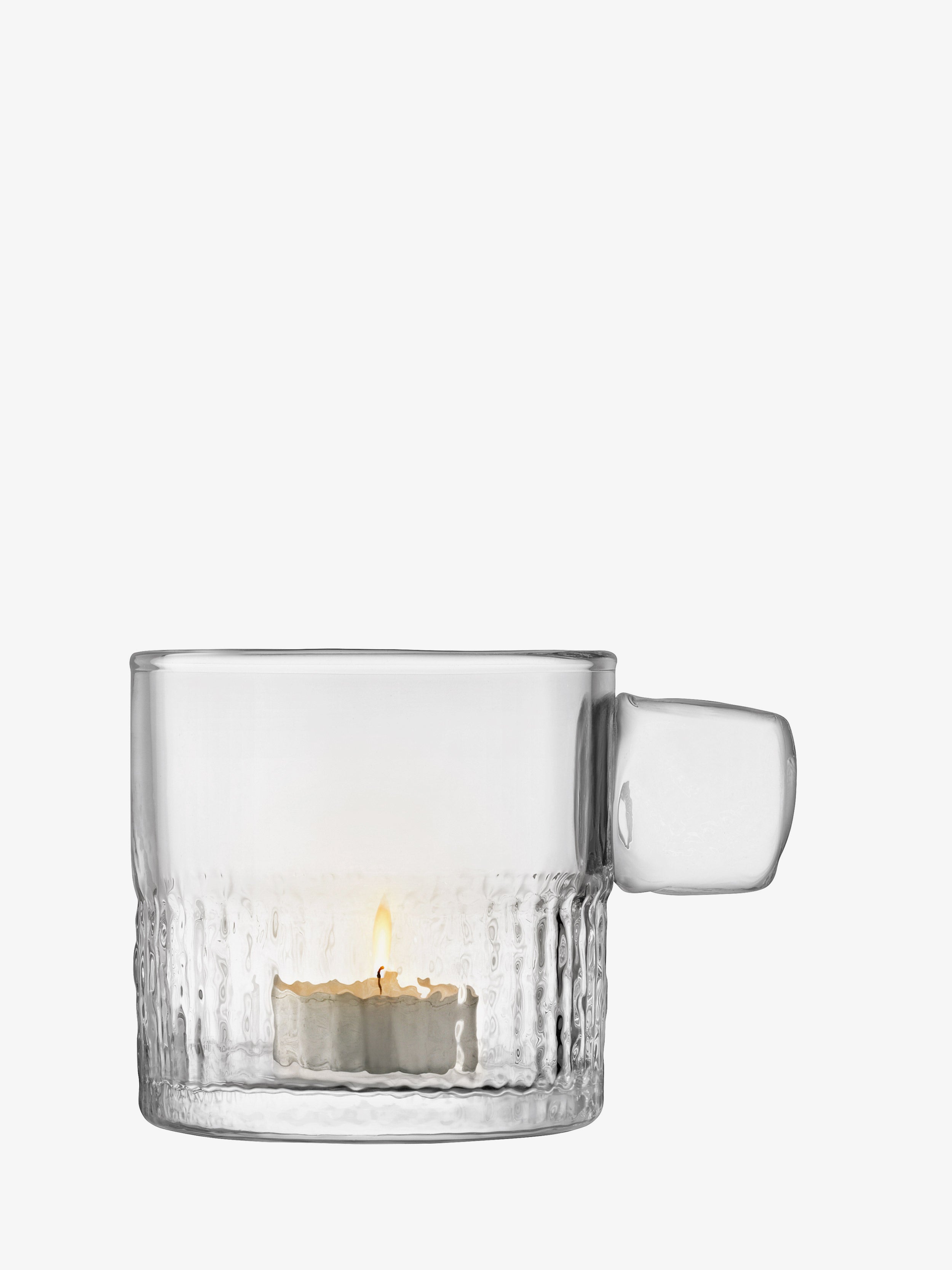 A mouth-blown glass tealight holder with a partially-textured finish and thick slab handle, formed by hand. The versatile design may be used as a tealight holder, mini vase or planter or container. Available in assorted colours.