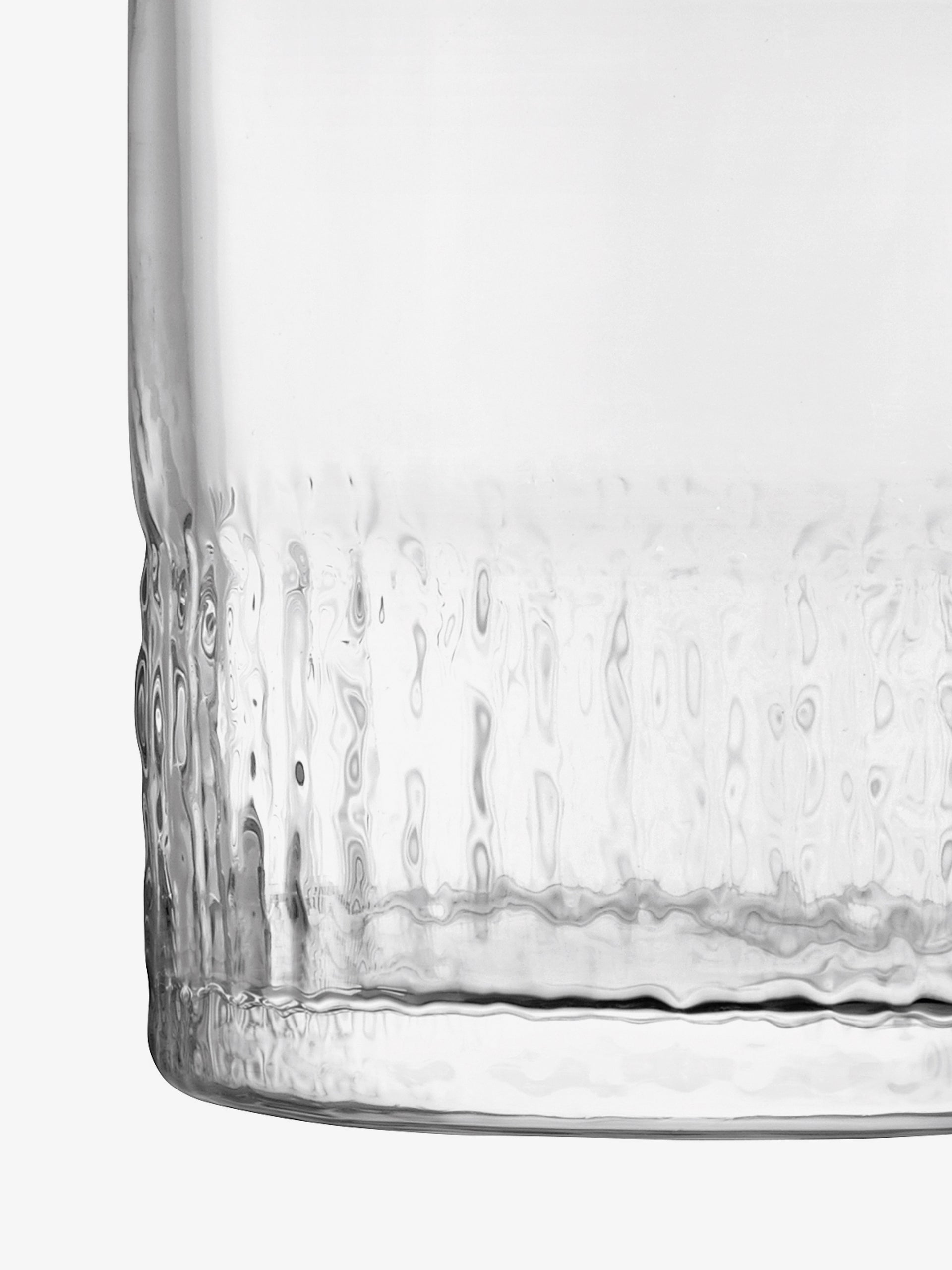 Mouth blown by skilled glassblowers to create a contemporary textured tealight holder. The textured effect is achieved by blowing the clear or cased glass gather into a wooden mould that is lined with a metal net. The rim of the glass is melted resulting in a smooth soft finish. The solid slab handle is formed separately and applied by hand.