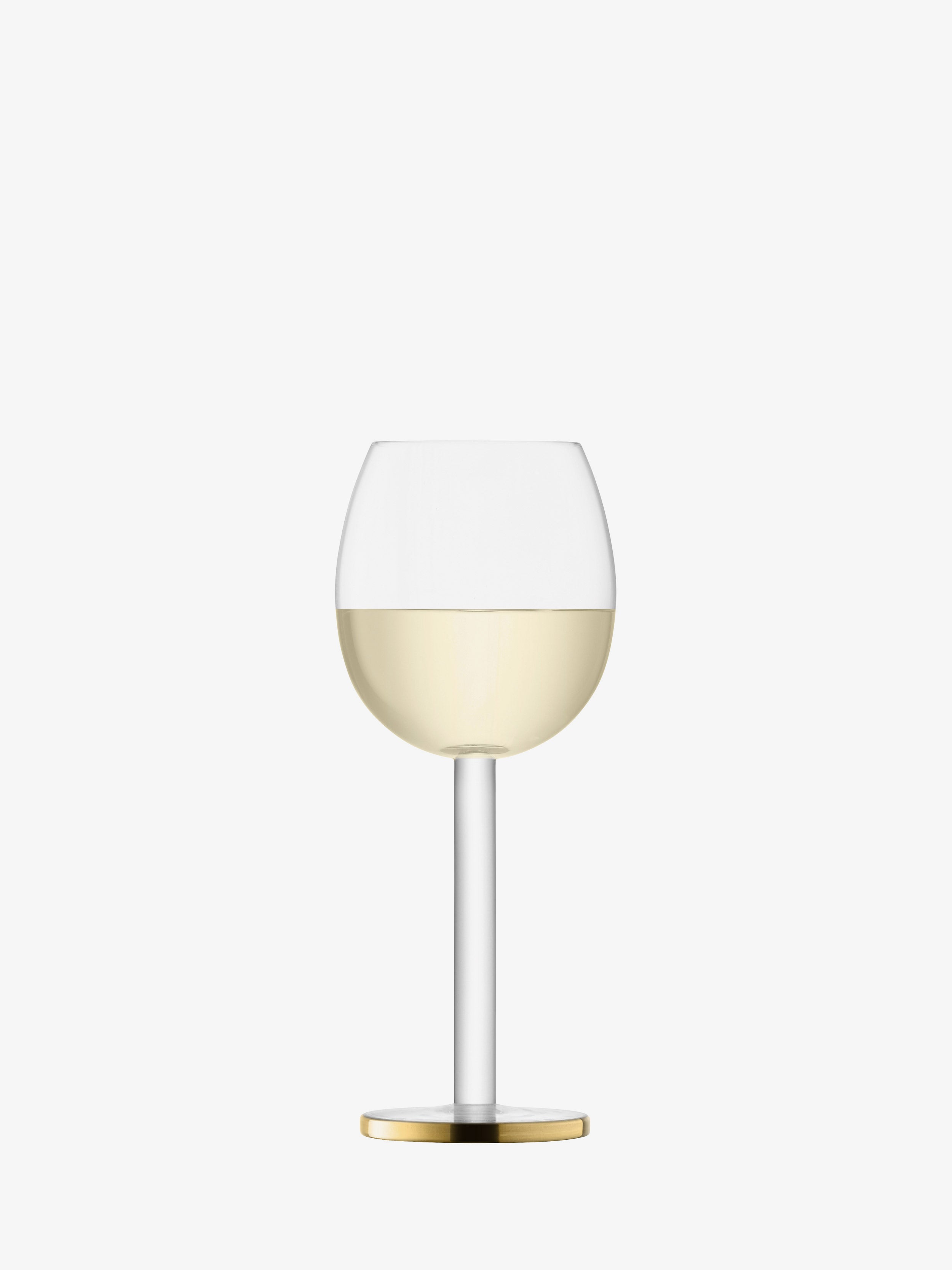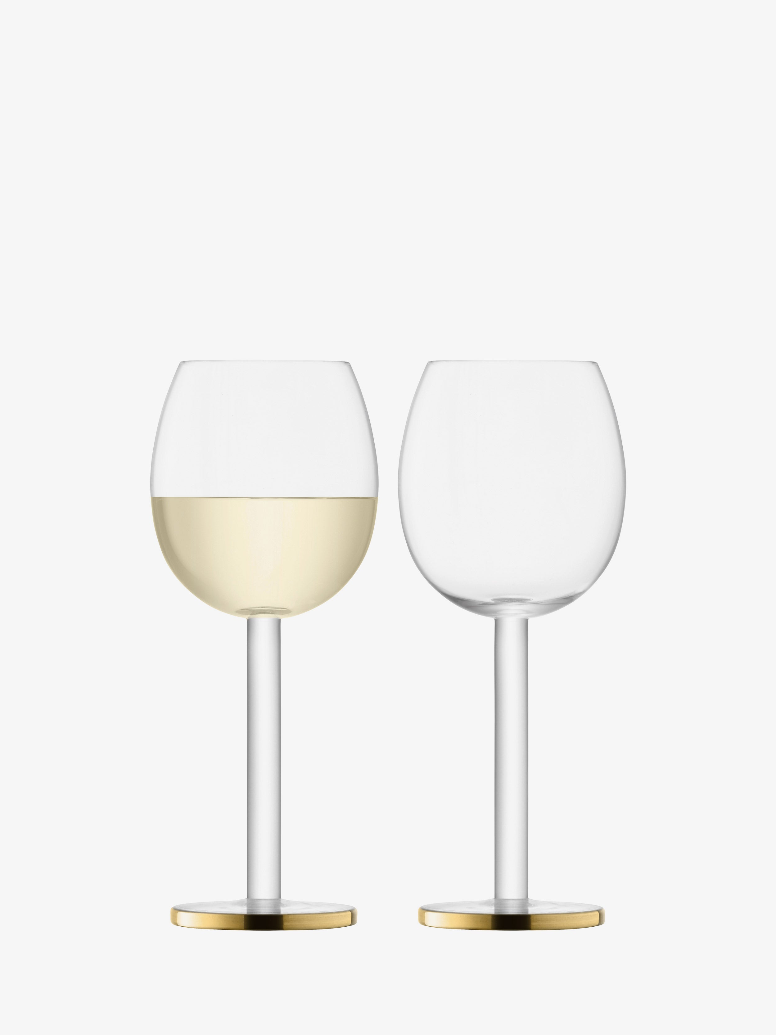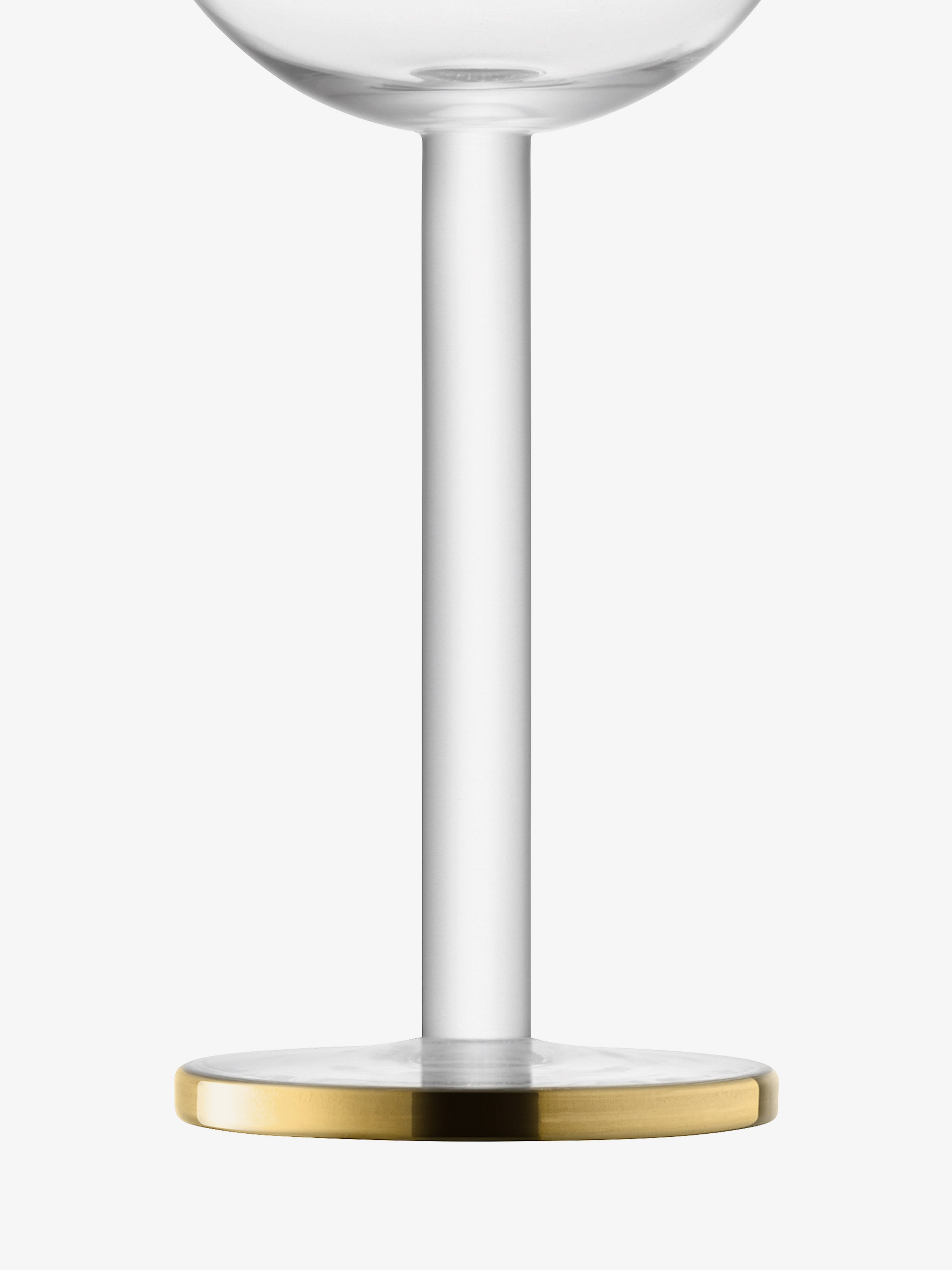 A pair of modernist mouth-blown glasses for red, white and rosé wine. A rounded bowl and thick tubular stem create a contemporary silhouette, hand painted at the feet with a wide gold band.