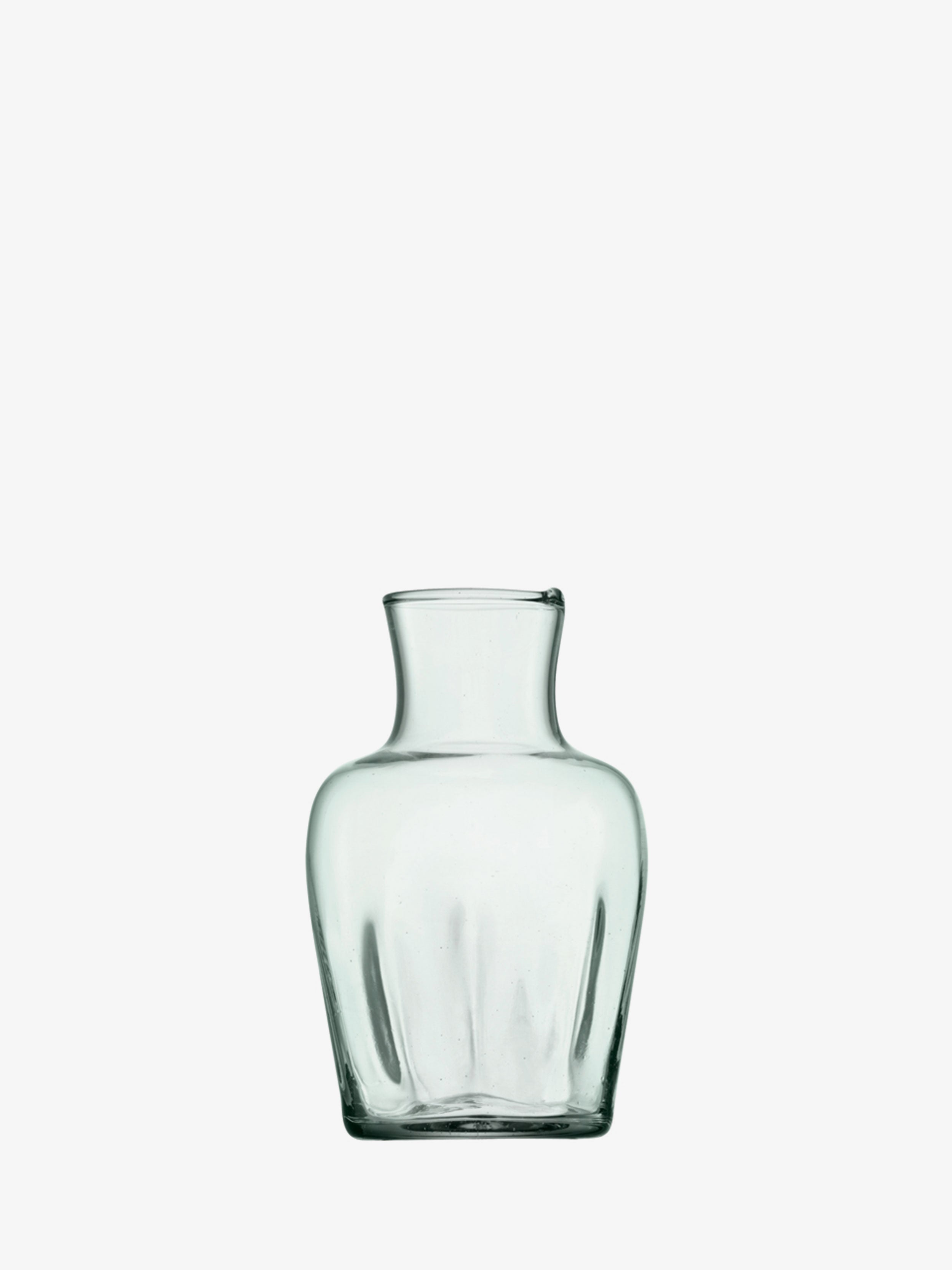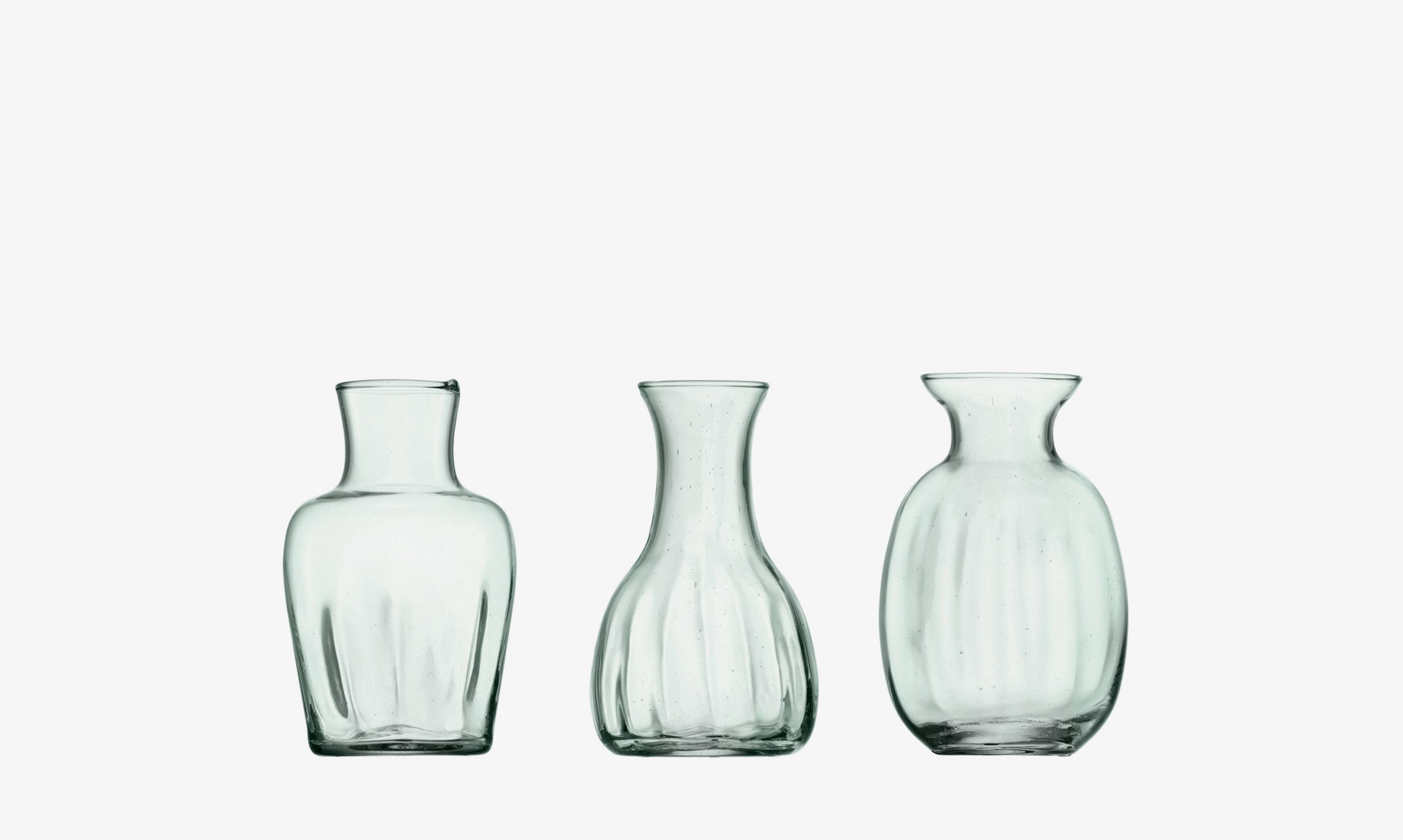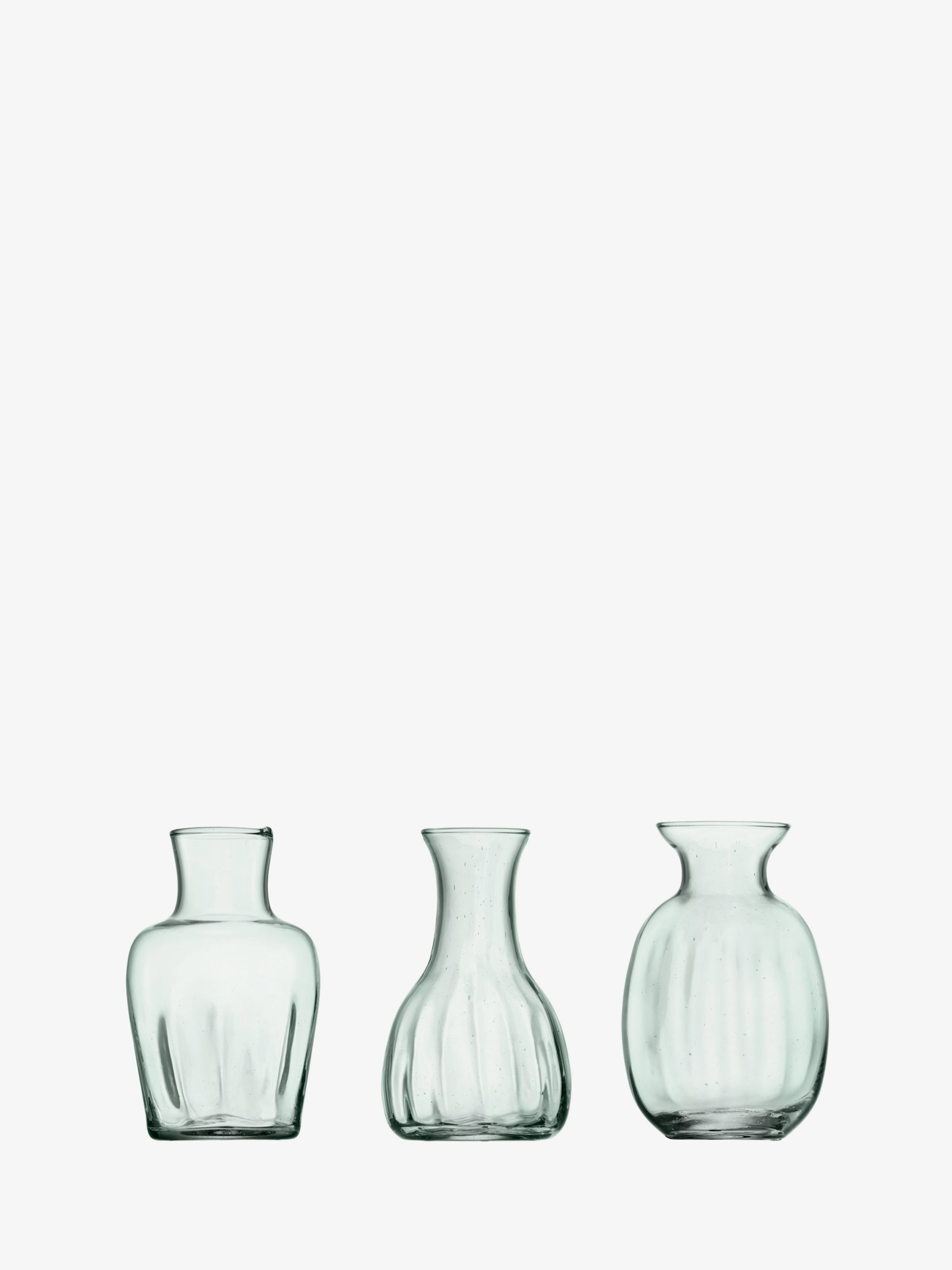A set of three small vases in different shapes with a subtly fluted texture. Mouth blown from 100% recycled glass. Ideal for single stems, a sprig of foliage or herbs from the garden.