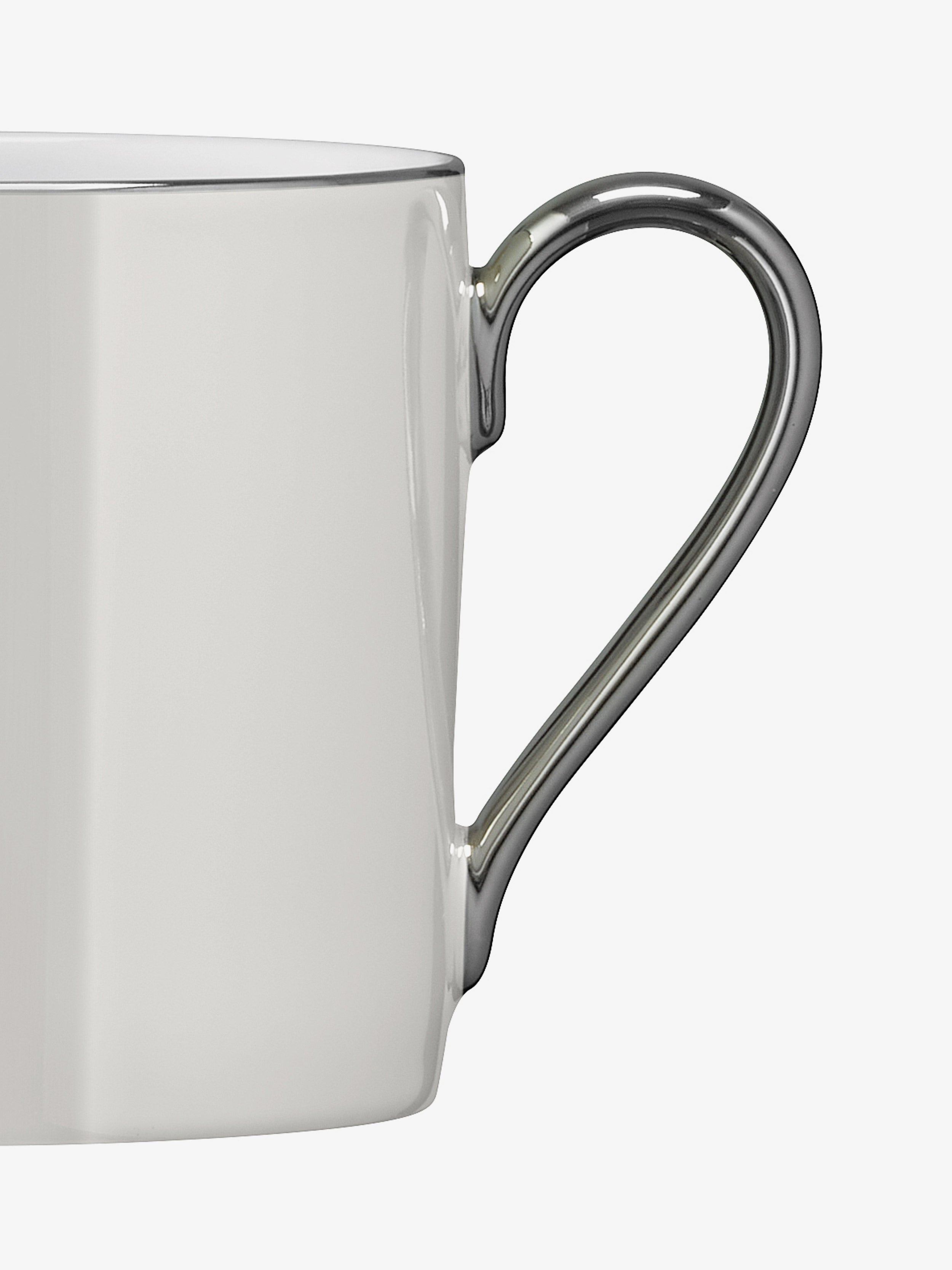 The vitrified porcelain mug is painted by hand with iridescent pearl lustre and finished with a platinum rim and handle.
