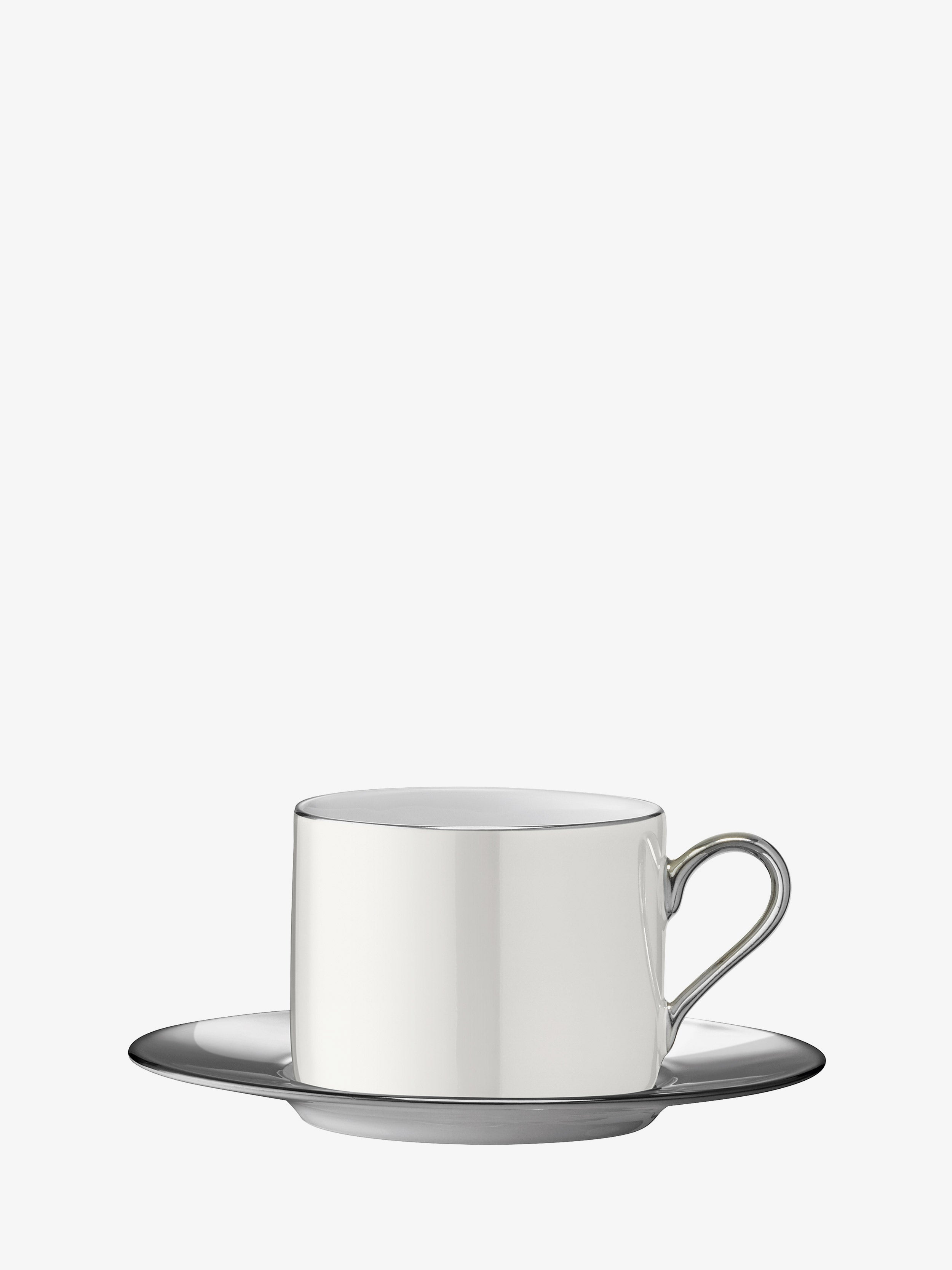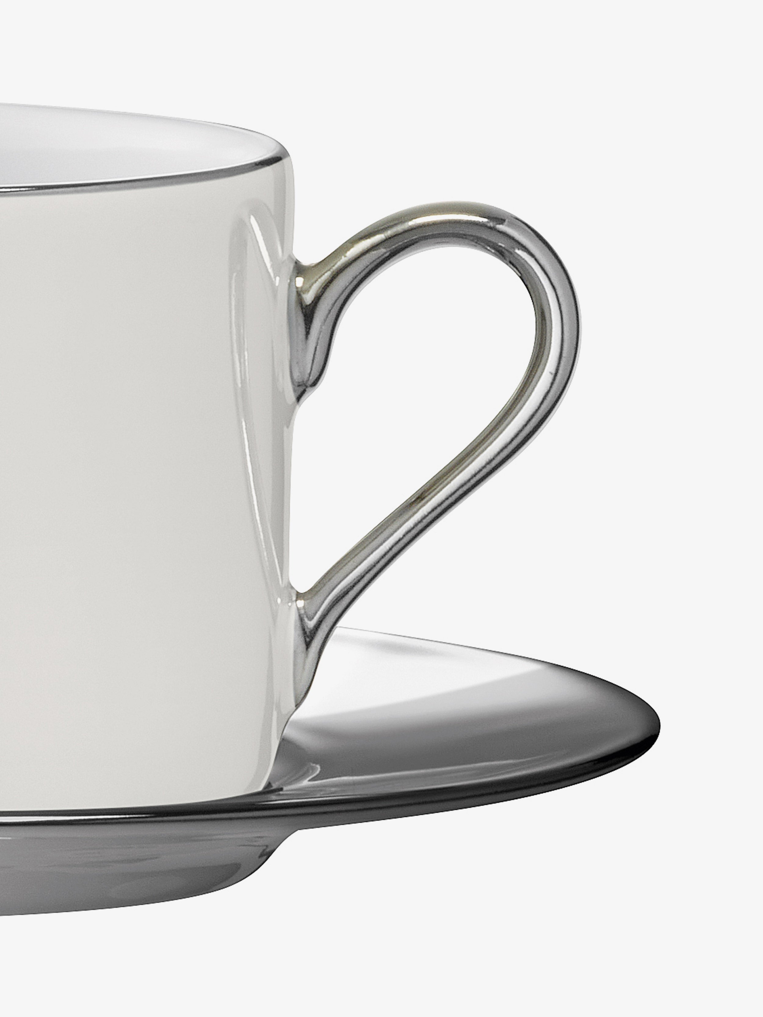 The body of the teacup is painted by hand with iridescent pearl lustre. Platinum is carefully hand-applied in a fine band around the rim, to the cup handle and in a thick band on the corresponding saucer for a reflective, opulent finish.