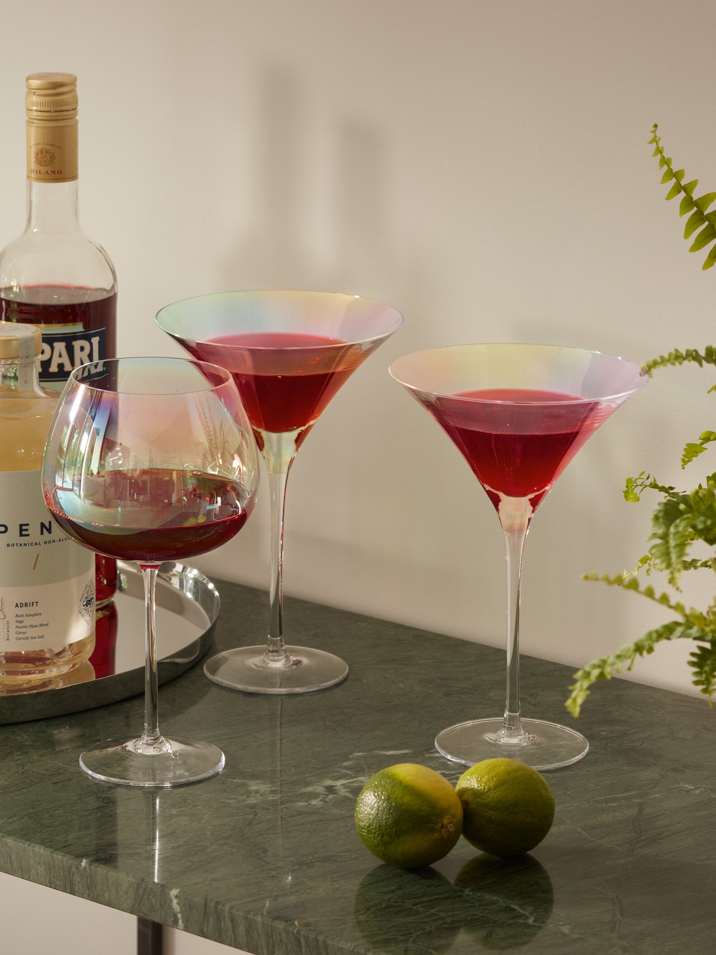 Set of two mouth-blown cocktail glasses hand painted with iridescent lustre. The conical bowls have a subtly-fluted texture which fades towards the rim.