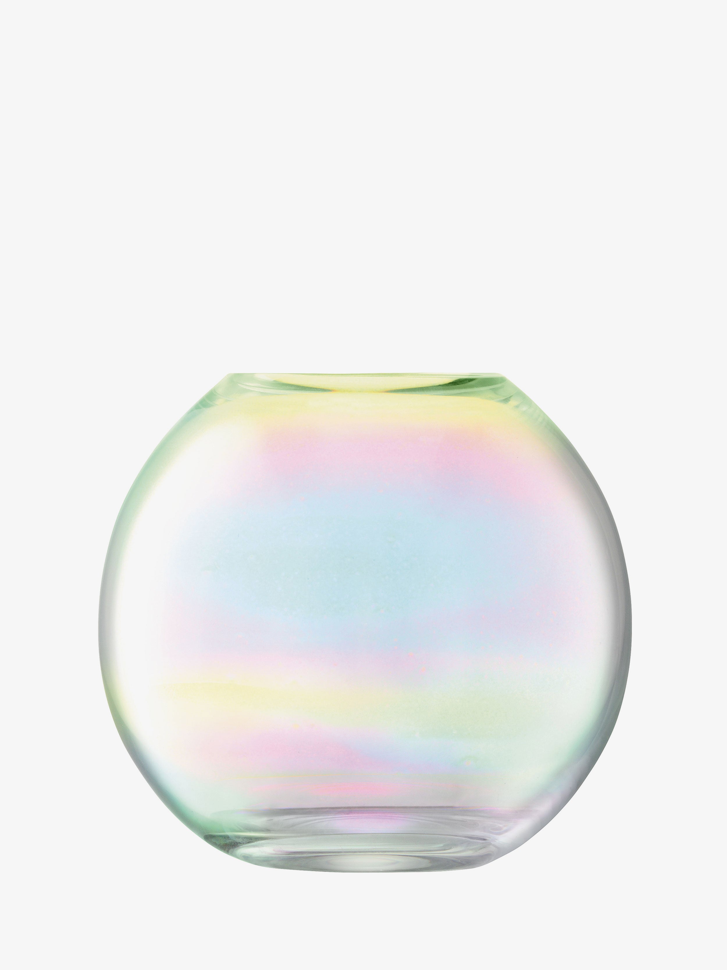 A mouth-blown glass vase with a spherical shape, hand painted with iridescent lustre.