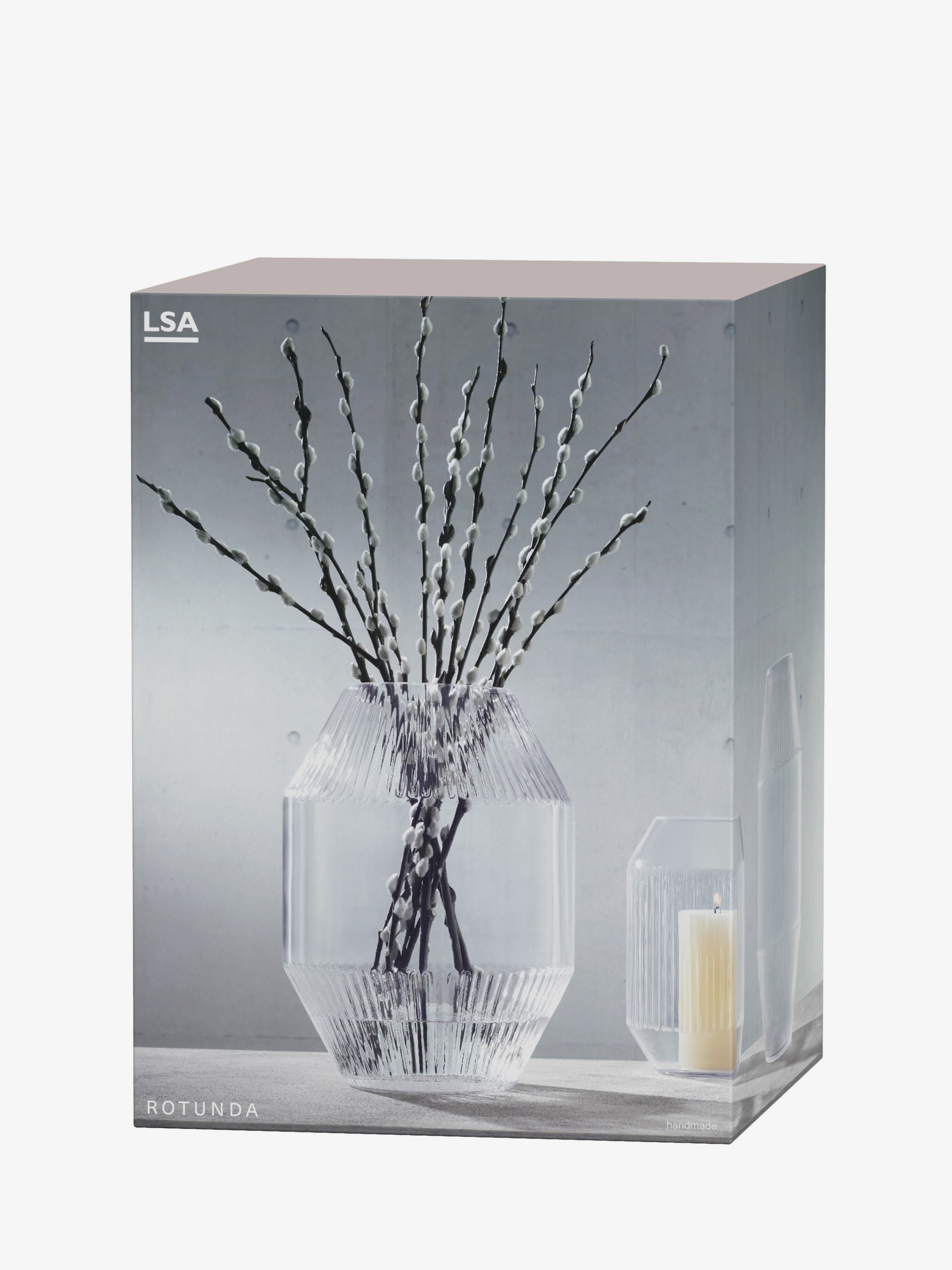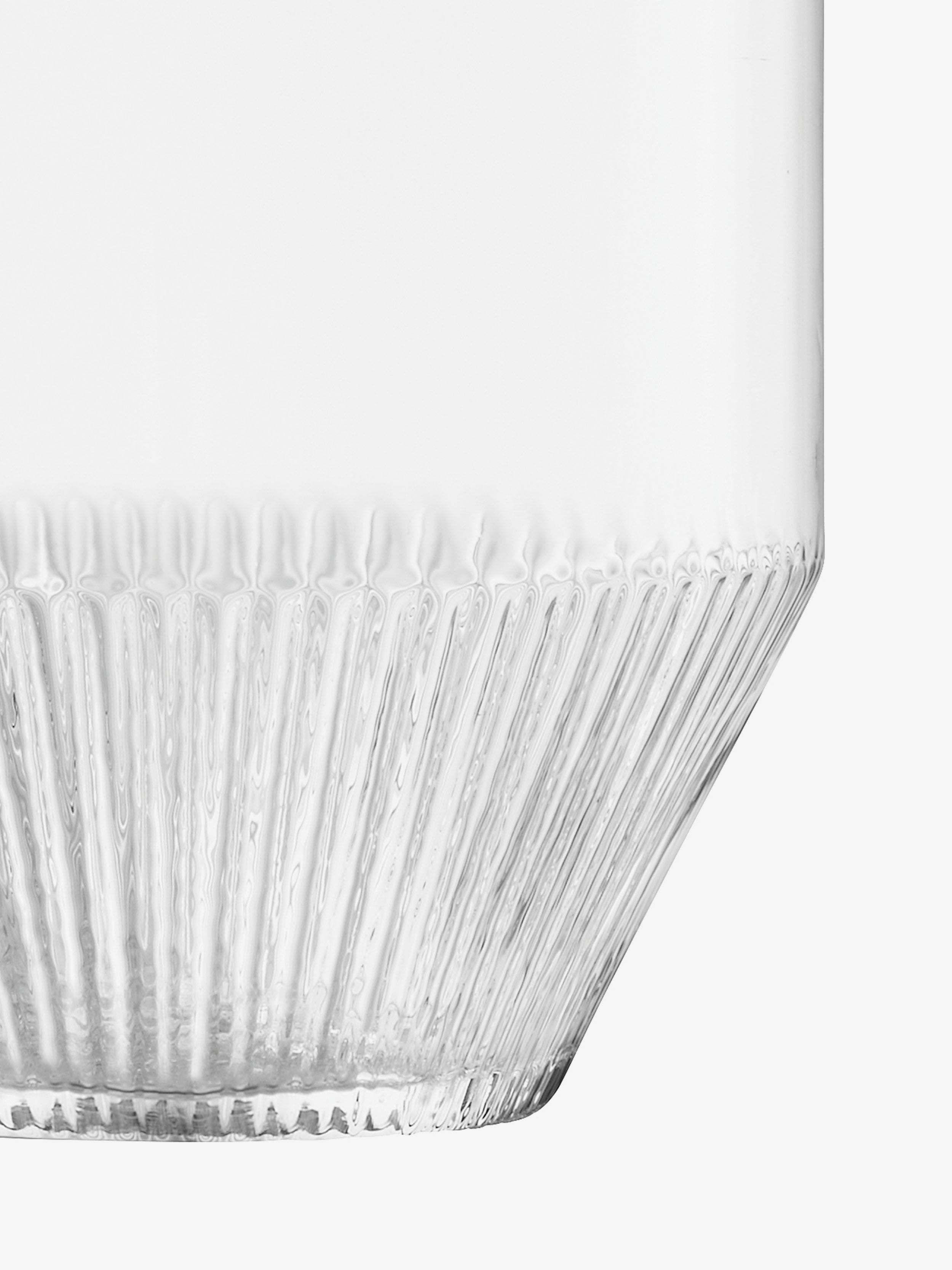 A large mouth-blown glass vase with bands of corrugated texture on the angled rim and base. Inspired by architectural detail. For branches or tall stems of flowers and foliage.