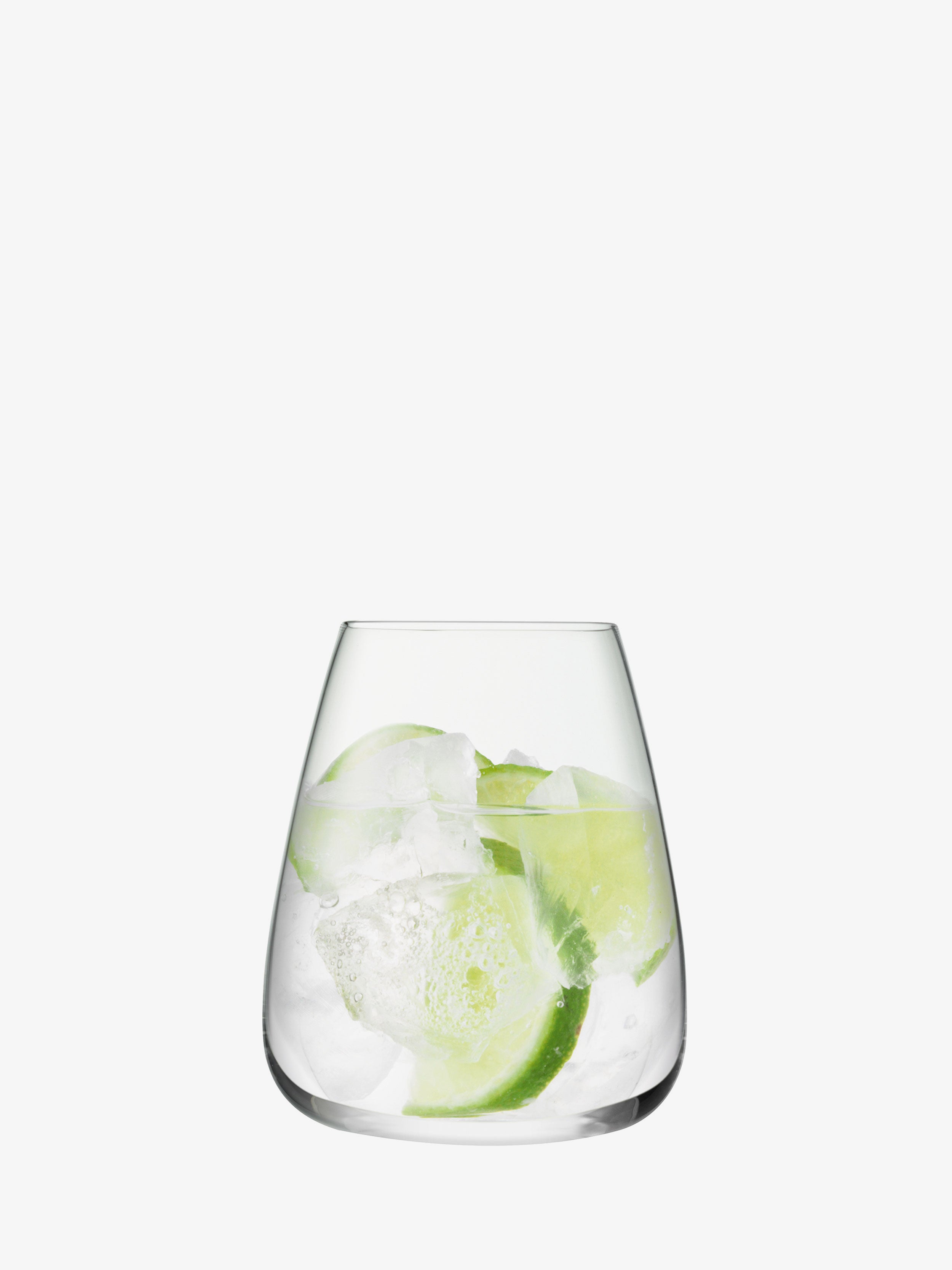A set of two modern stemless glasses for water, wine or long drinks. Expert craftsmanship is required to mouth blow the fine, flat-based bowls.